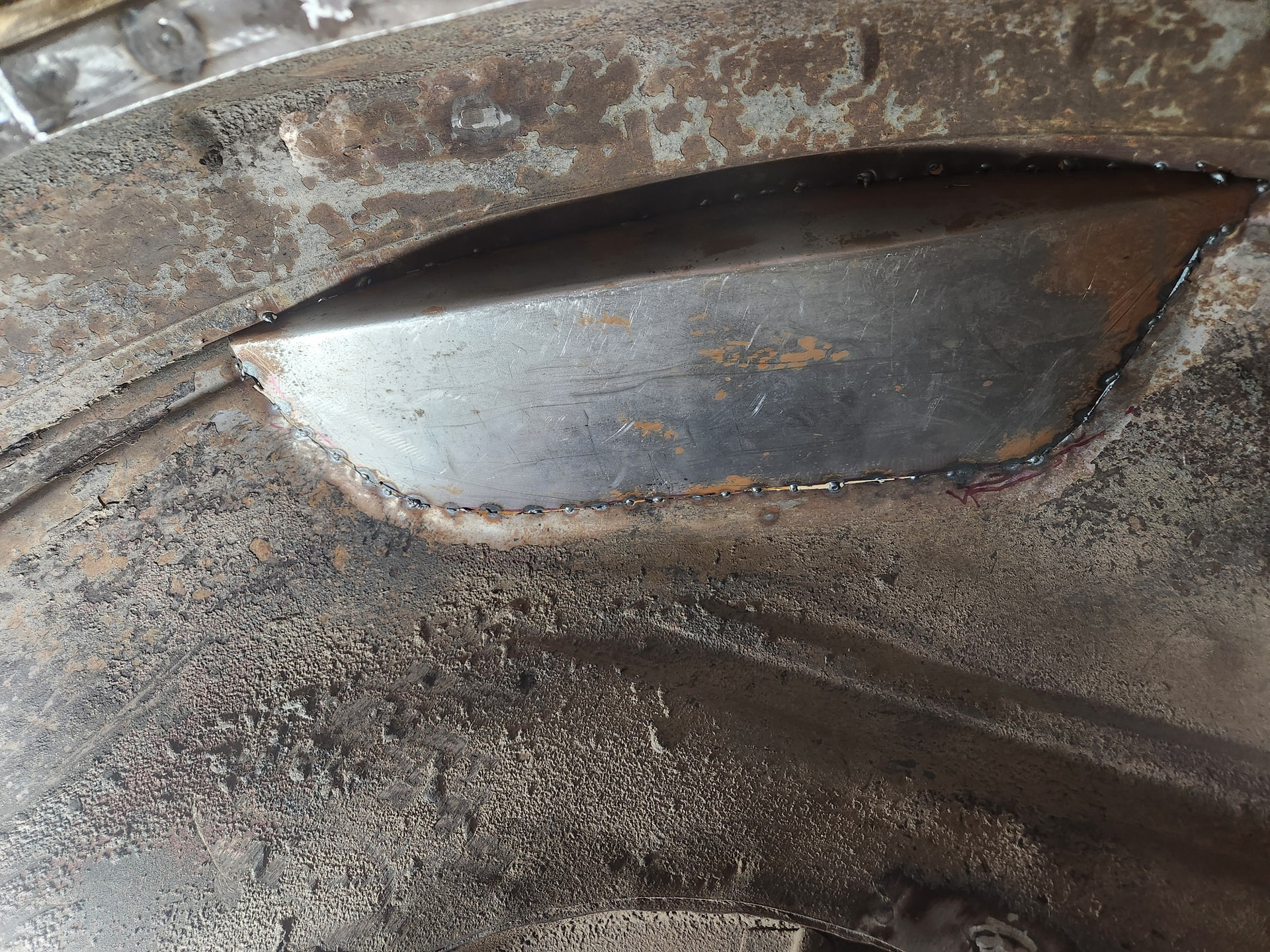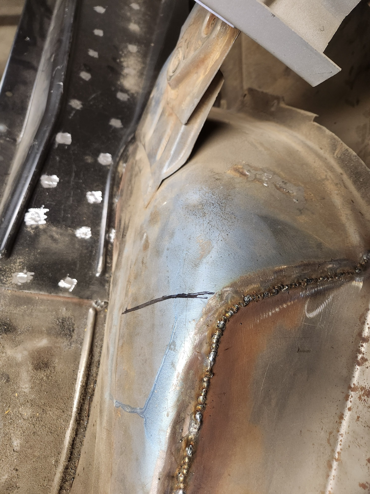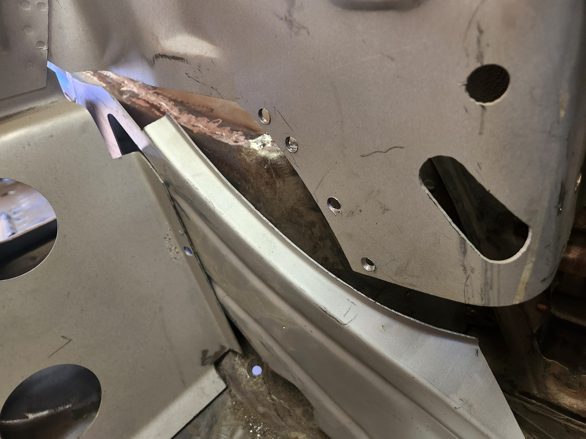 Tight spot. Difficult to get the tip of the welder in the 2” deep recess. Same thing for the grinder so must use a large diameter wheel. Slow, tedious, but doable. Thinking back I probably should have added a flange to my new panel and plug-welded this rather than trying to get a fillet into this tight spot. Oh well.