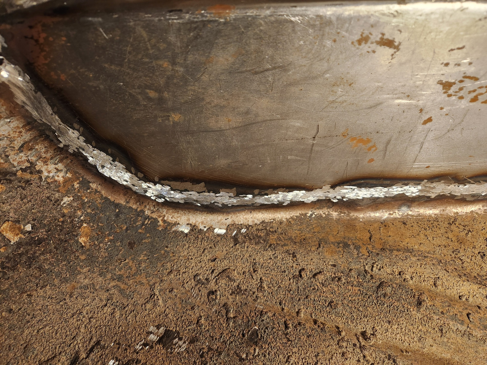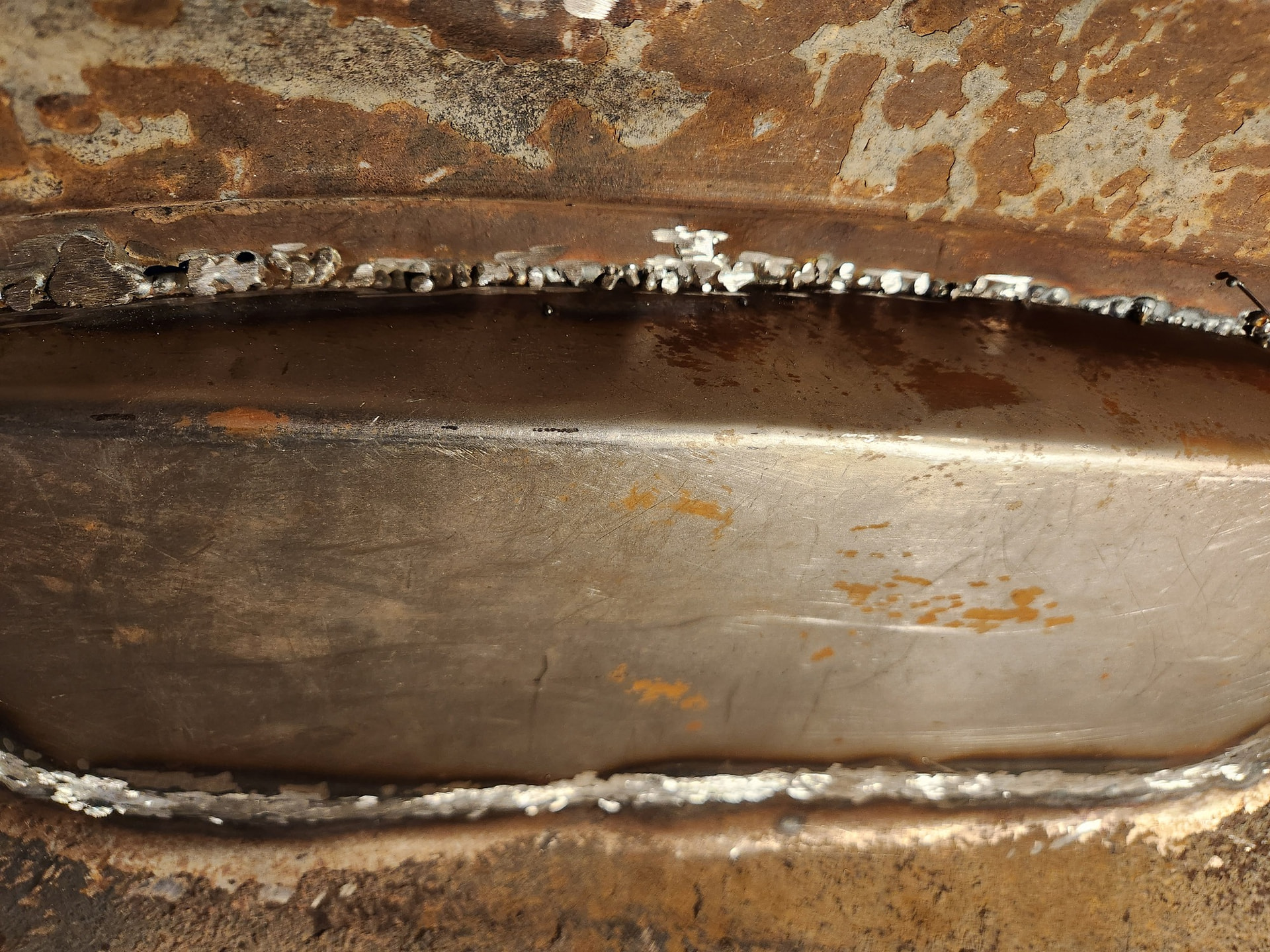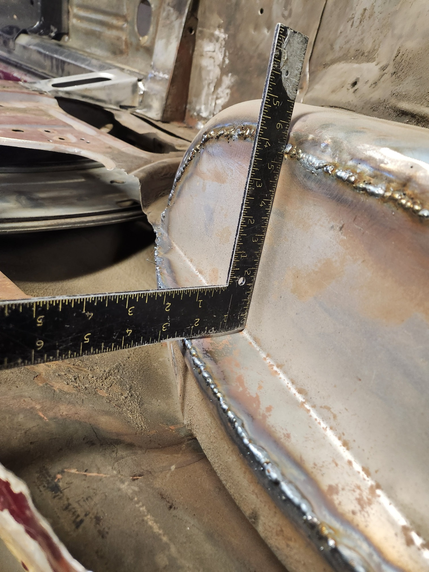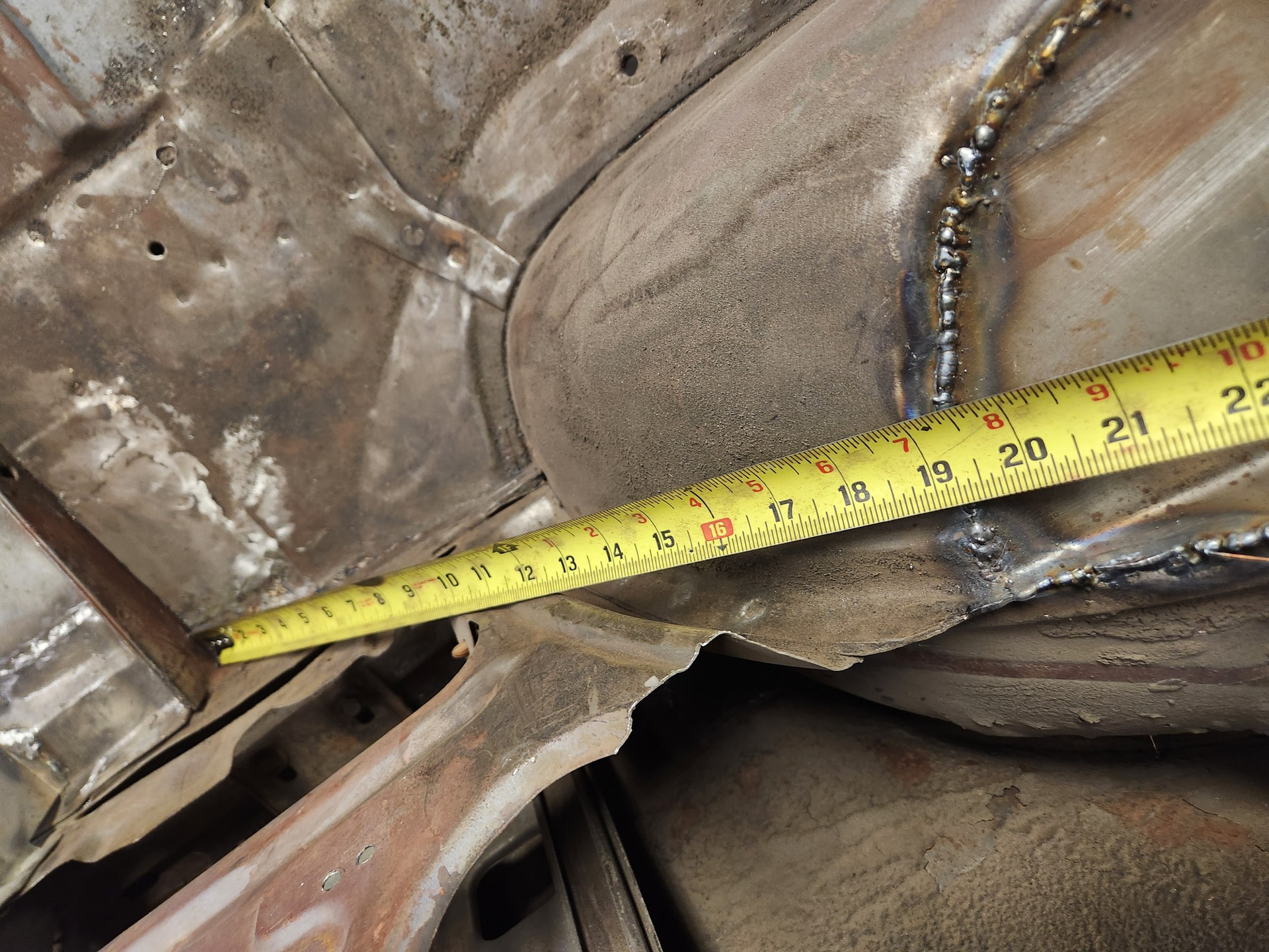 Tight spot. Difficult to get the tip of the welder in the 2” deep recess. Same thing for the grinder so must use a large diameter wheel. Slow, tedious, but doable. Thinking back I probably should have added a flange to my new panel and plug-welded this rather than trying to get a fillet into this tight spot. Oh well.
