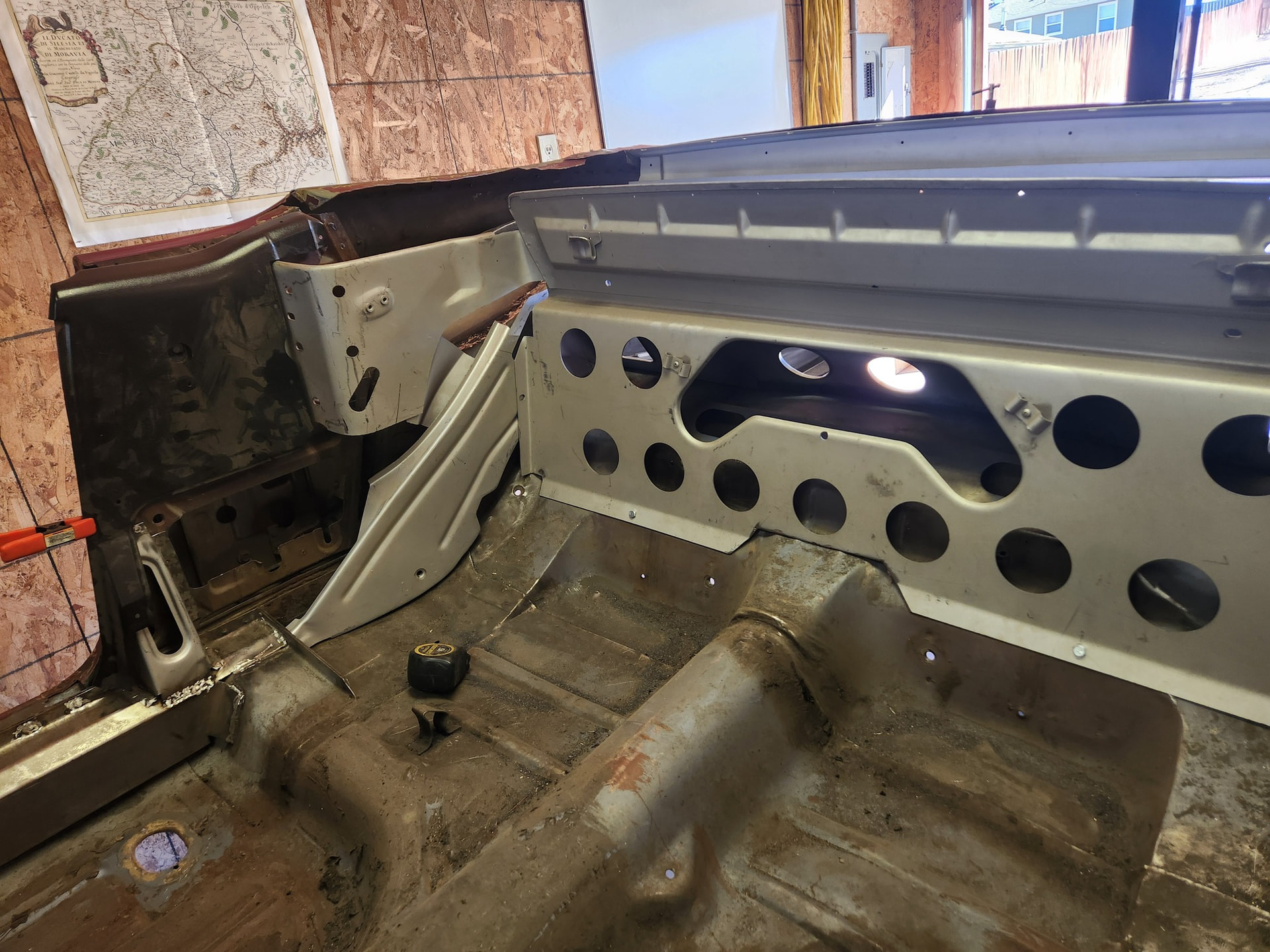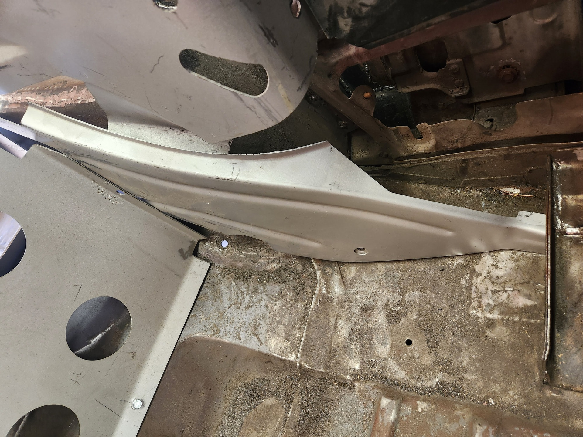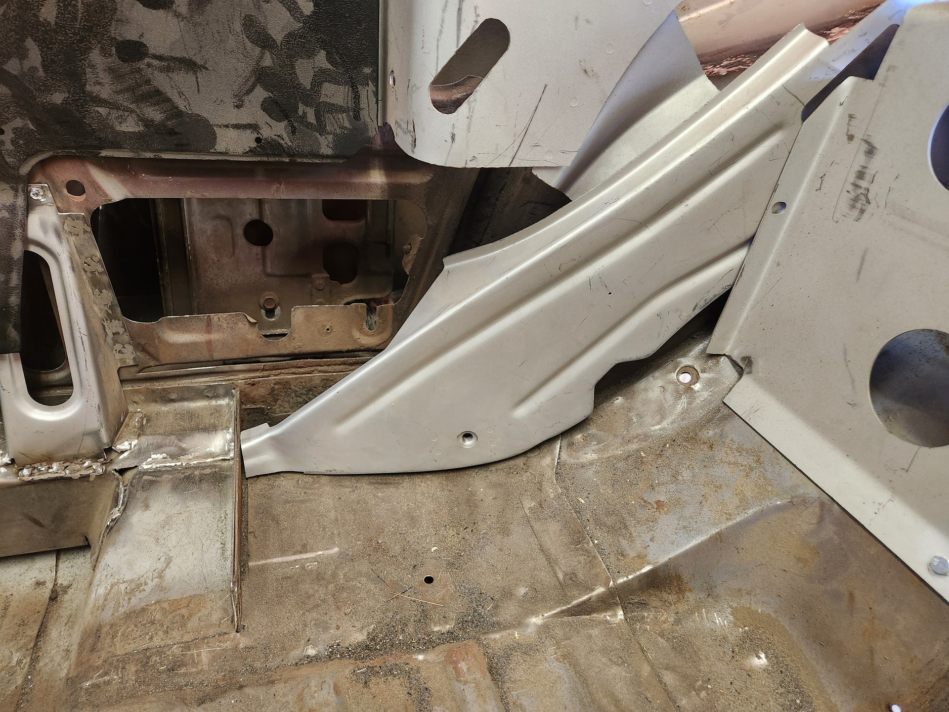 The real problem is the quart wheelhouse reinforcements. These are going to need tweaking. I want them to fit the floor profile over the torque box. But there is a good gap of about 1/8”. The issue is that the hump for the rear axle has a different curve and there is going to be some cutting.