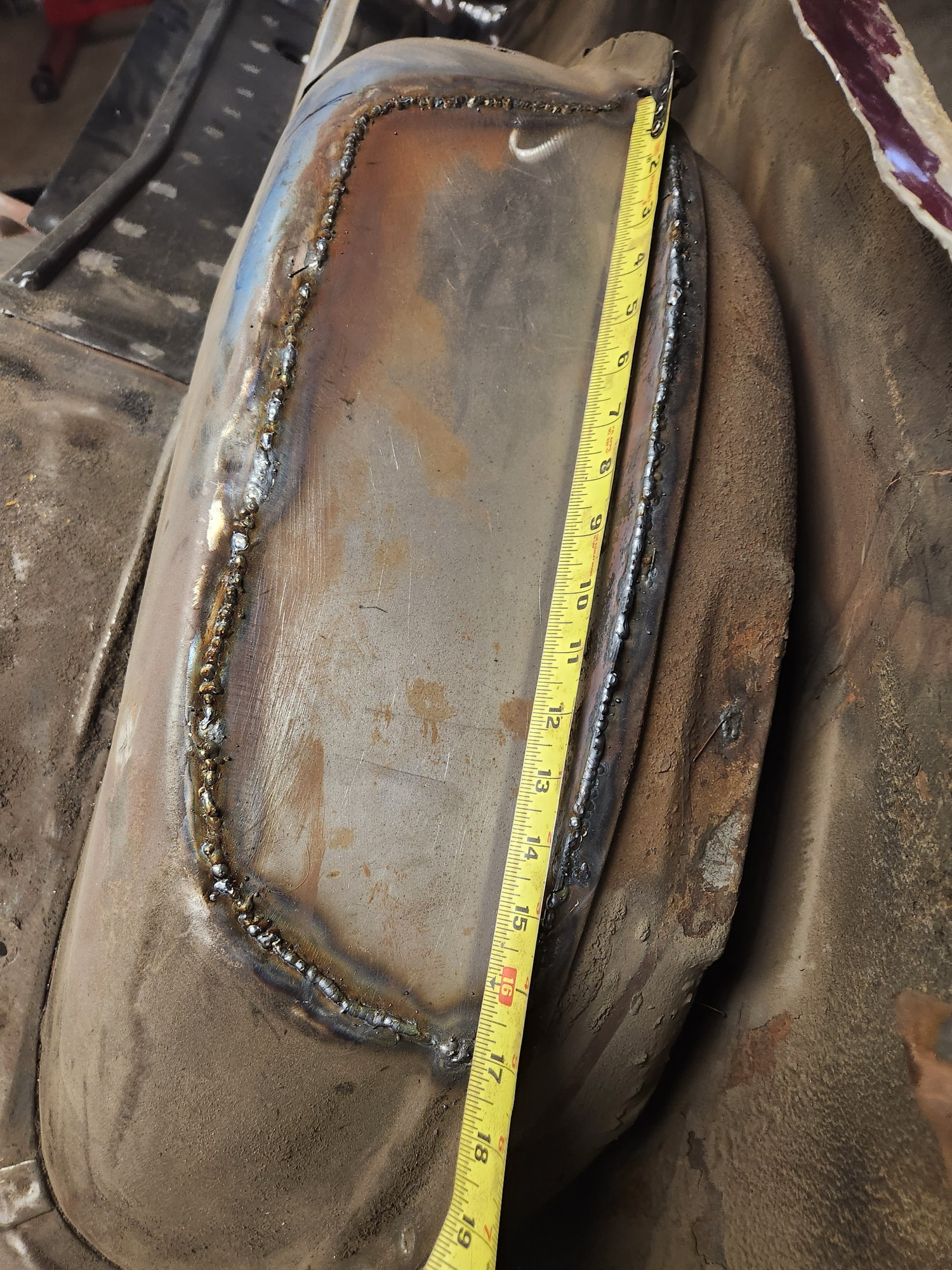 Burning-in the new metal into the modified wheelhouses. Some dimensions and pics. New piece was 17x5.5 with 2” 90-degree lip on the long side and then trimmed to fit. The piece sits parallel to the axle and is inclined front/back as shown in the pics. The back of the piece ends pretty much with the centerline of the axle.
