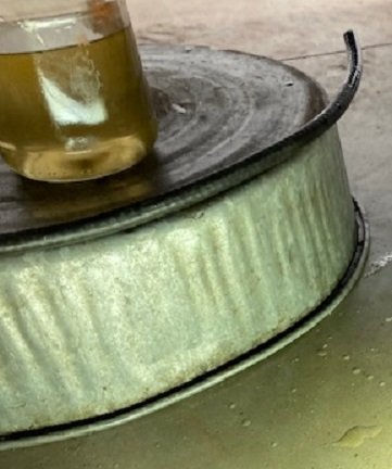 The RH front brake gets the wrench installed (different size Snap On brake bleeder wrench) the hose put in place, the jar of brake fluid at the bottom of the hose, and the valve is opened. Ten pumps of the pedal and the angle holds the pedal down. Reservoir is topped up. Ten pumps of the pedal. Reservoir is topped up. Bleeder valve is closed. All the items are moved to the LH front brake.