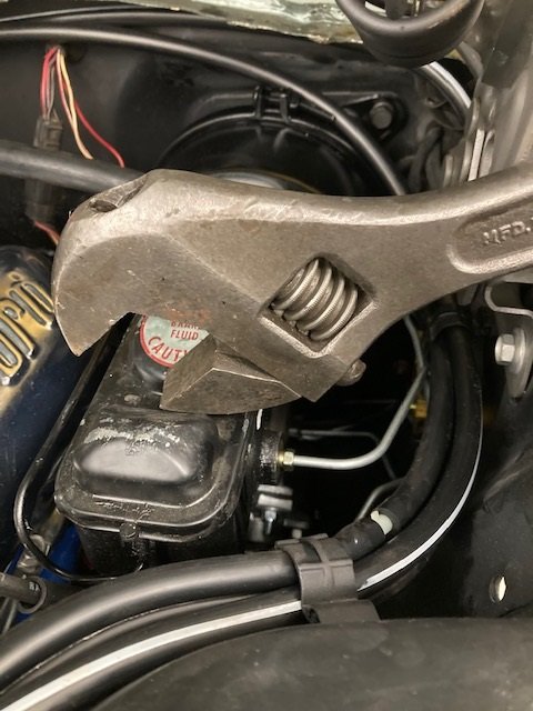 I bled the brakes my usual way. A piece of L - angle was used to hold the pedal down while changing from one wheel cylinder to the next. An extra master cylinder cap was used so I wouldn’t scuff up the one belonging to the car. Instead of installing the bale clamp when topping off the reservoirs I used a big crescent wrench to weight it down.