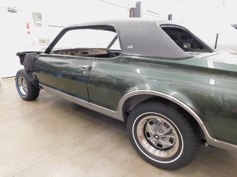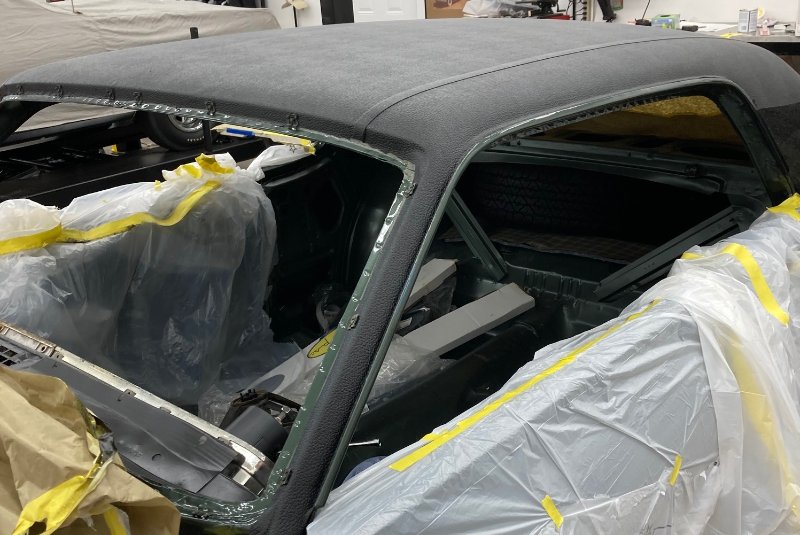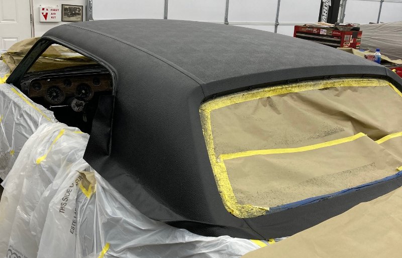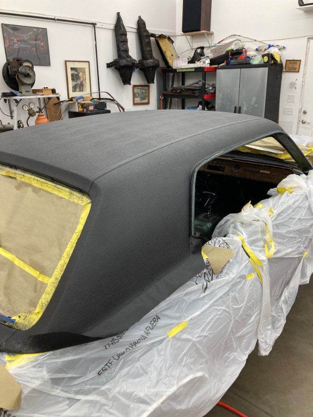 Today Phil Childers came over to help me put the second vinyl top on. We got maybe 80% done. Still a lot of trimming needed, installing moldings and such. But it is looking fabulous compared to the previous try. Thanks Phil!