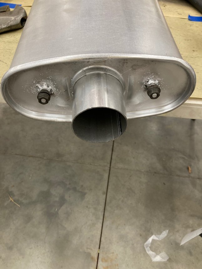 This car is going to be mostly concours correct. The exhaust system is going to look factory but be a little bit better than stock. This is my first idea on making the mufflers work with the factory hangars. This ended up being ground off in favor of another idea that worked better. This was going to work OK but there would be studs and nuts securing the mufflers to the hangars. I found long threaded receptacles at the hardware store today, so those will be used so we can also use the factory hardware to support the mufflers at the hangars.