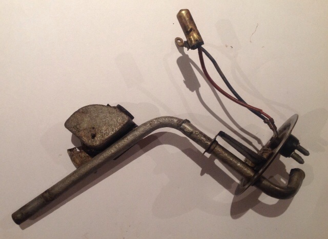 The fuel sender actually cleaned up ok once all the crud was removed. The exterior is nice and complete, the inside tank portion has some surface pitting, the filter was very brittle and fell to pieces, the float was completely gone. This is actually very close in configuration to the Dorman unit, except for the single versus triple plug.