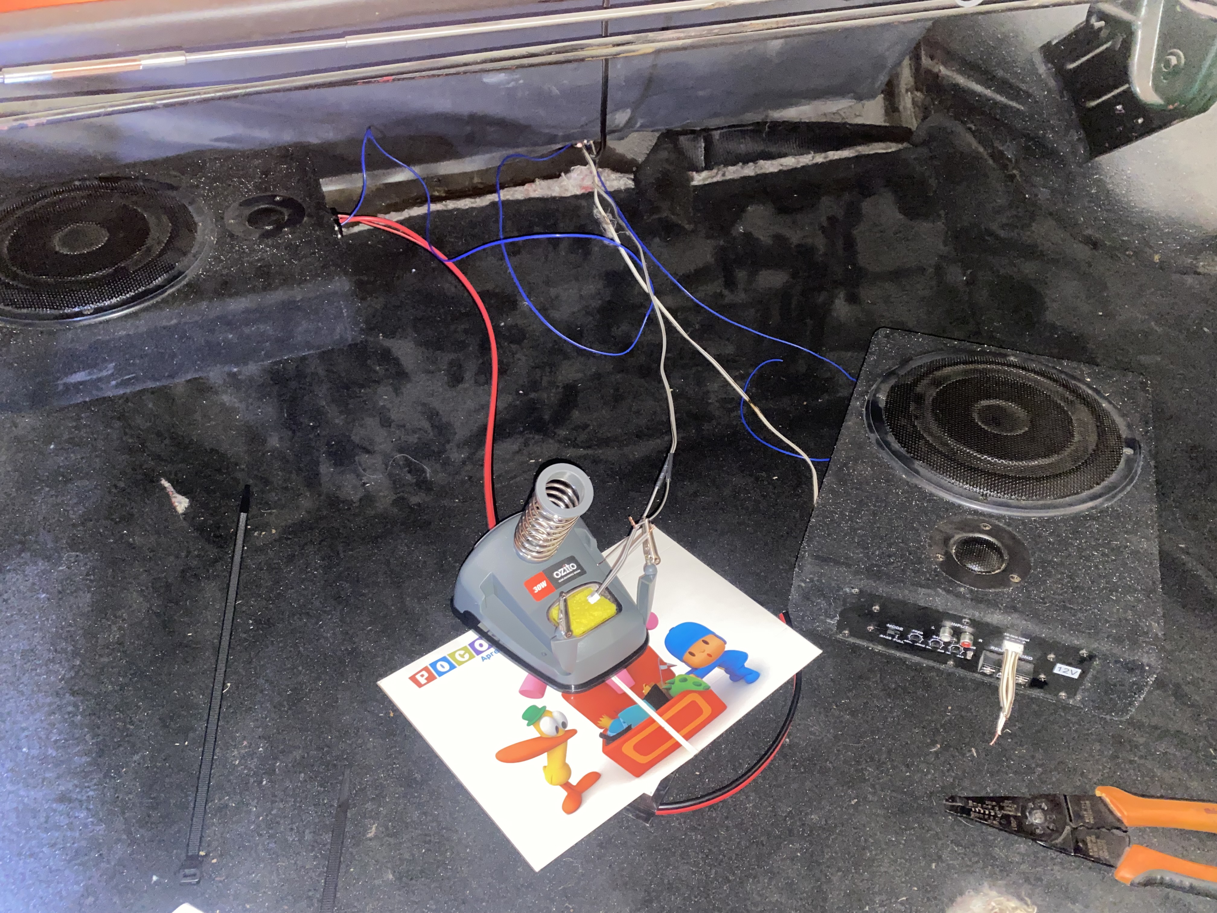 I fished pos and negative amp power through the firewall having removed the cluster, (this was something I could not do without cluster out) I also put in an amp trigger and fished both down the door jamb and through the sill. The amps both had speaker line level inputs on computer style connectors, so I fabricated some splitting pig tails.
