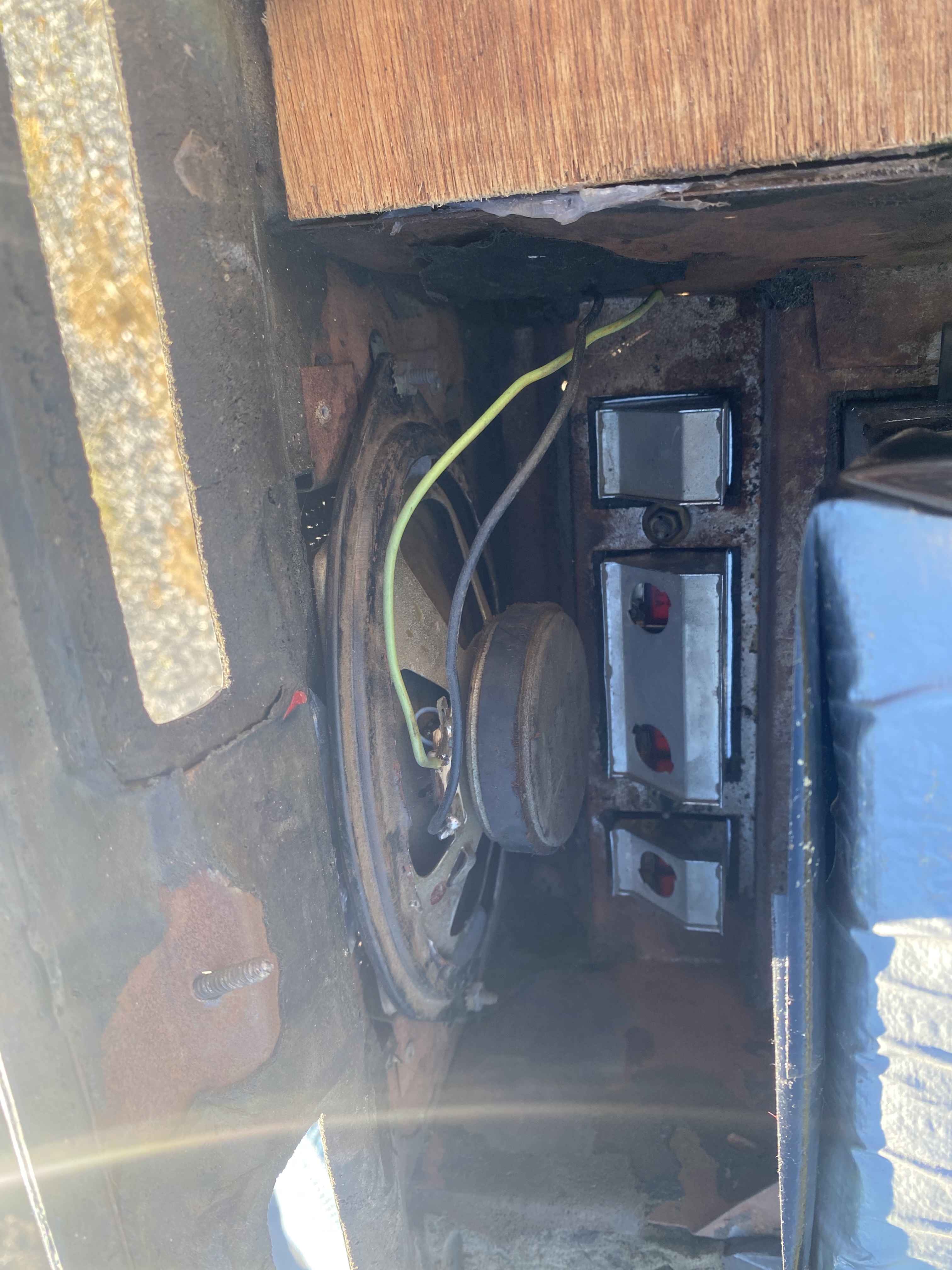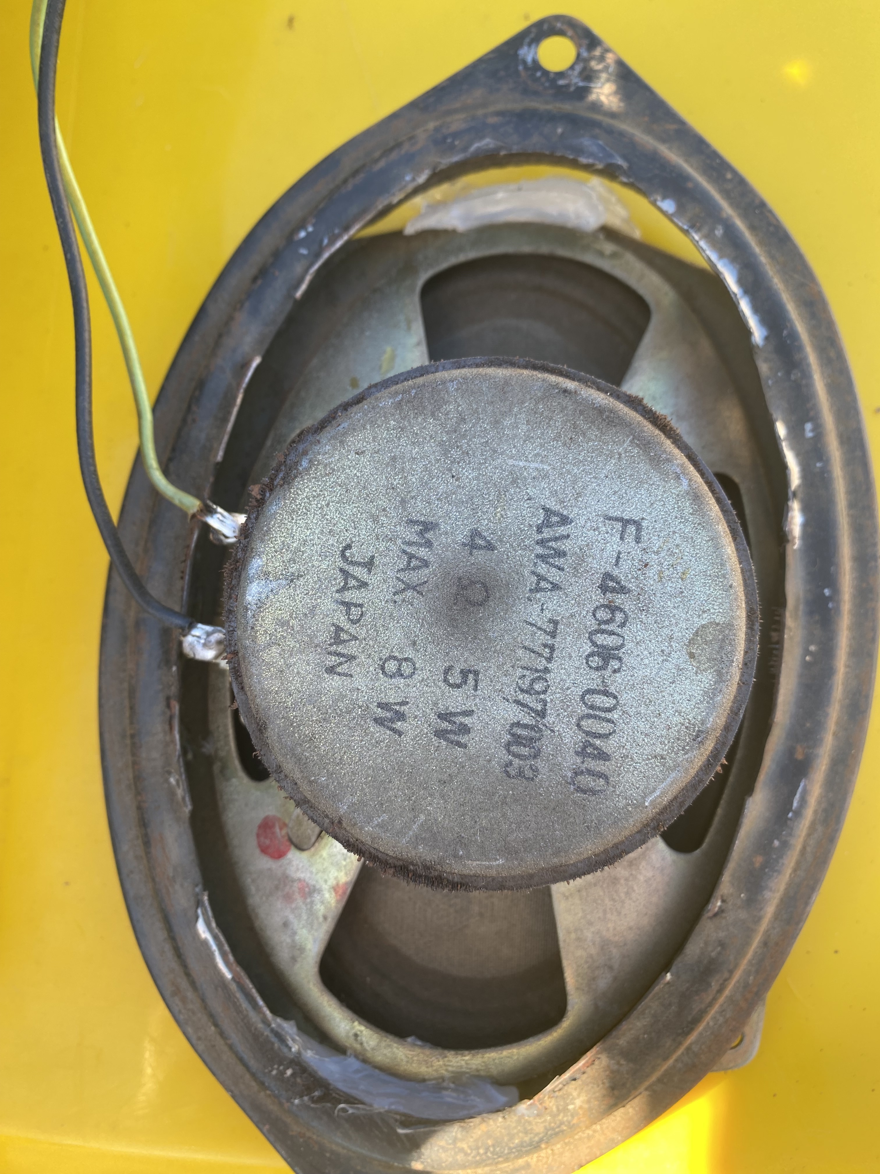 I wanted to give the GPS antenna its best chance, so I taped it above the unconnected air registers. That would have it shielded by the front center (unconnected) speaker, so I pulled that out . I thought if it was original someone might want it (free to good home)⦠but it is a fragile weathered paper coned $hite thing⦠kinda dodged up crap looking, unlikely to be oem.