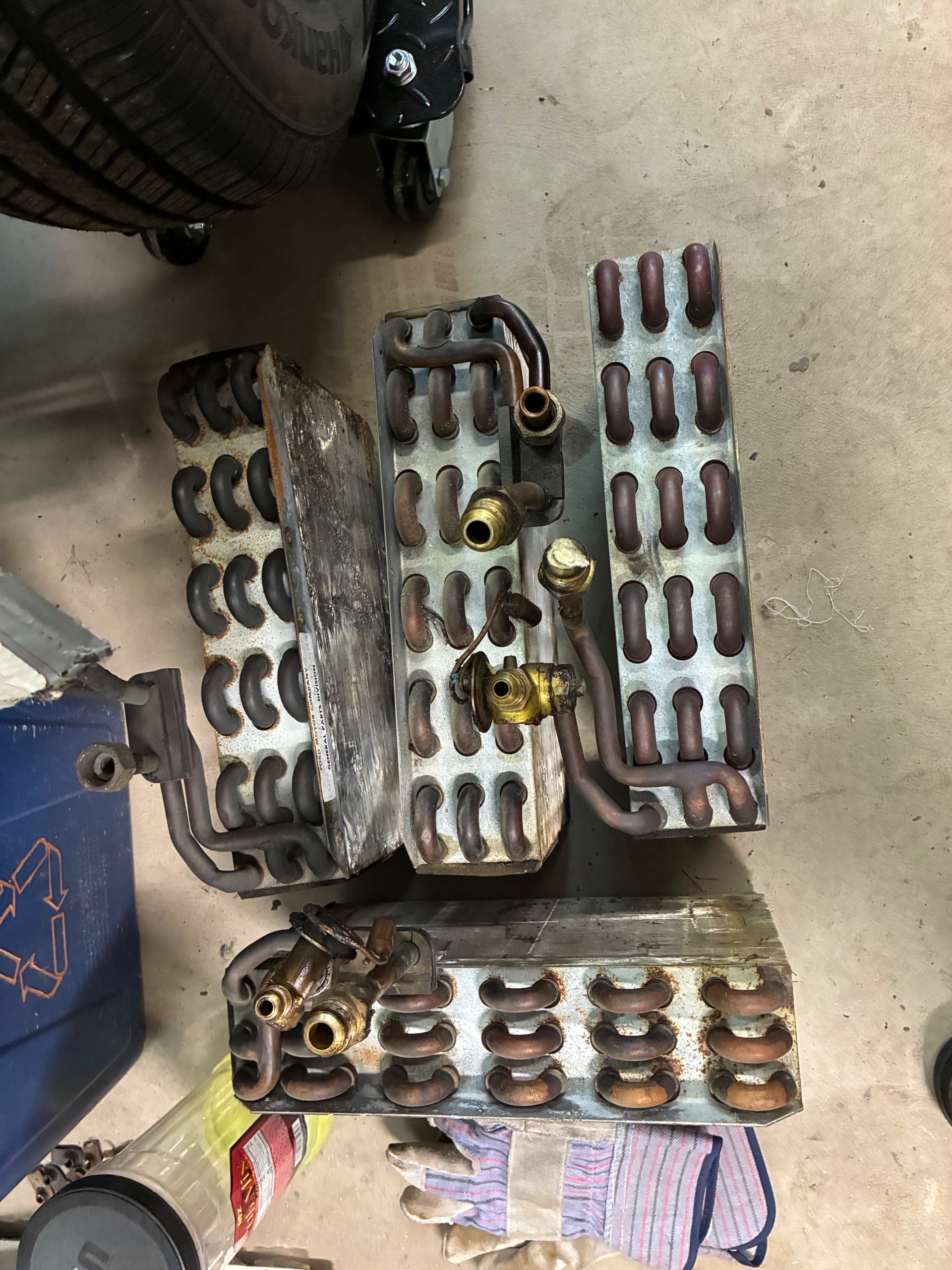 Here’s the 4 good evaporator cores that I wound up with. I haven’t tested them yet but I’m confident they’re ok. I also have one that I’m sure is trash. I’m using that as my learning tool to try and remove expansion valves without destroying them.