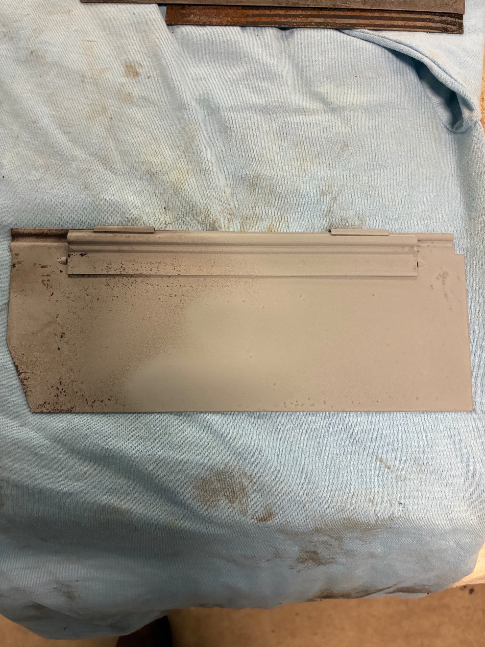 One of the doors that was particularly rusty went in the blasting cabinet. Of course that removed virtually all the galvanized finish. So as an experiment I picked up a can of cold galvanizing compound. It looks nothing like it should, but I guess having something on it is better than nothing.