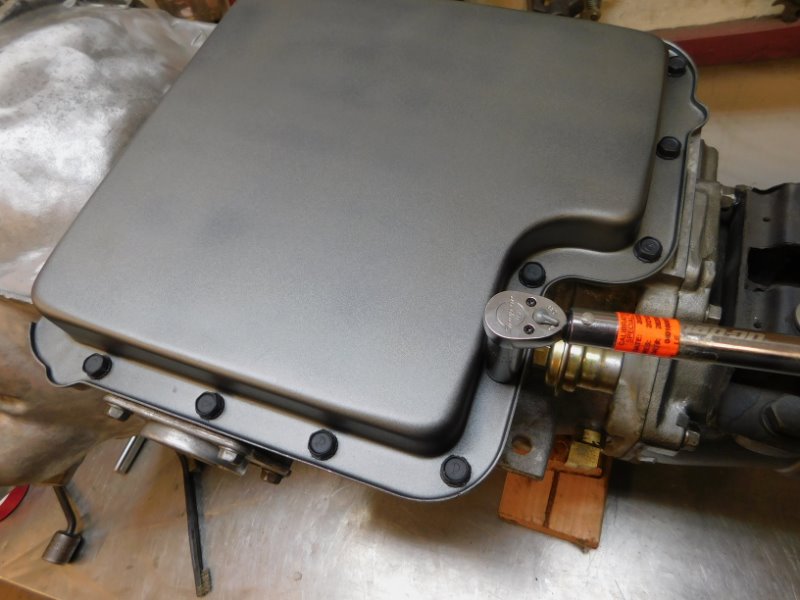 The tailshaft was installed with a new gasket and torqued to specs. I adjusted the intermediate band and torqued the seal nut. Then the new pan gasket was positioned. The pan bolts were all started and run down with a speed handle. Then the pan was torqued to specs.