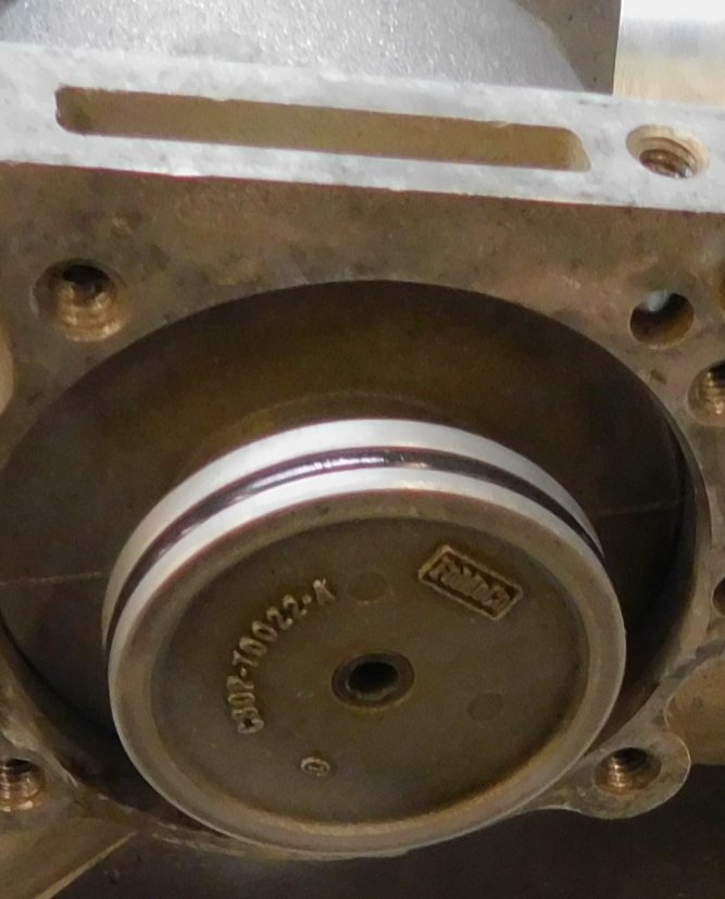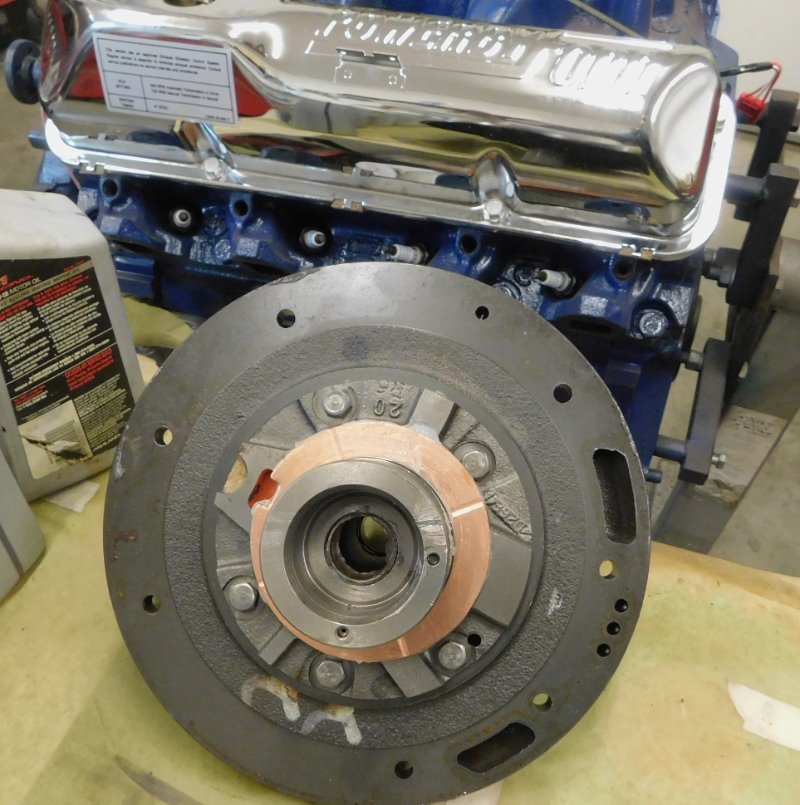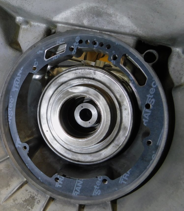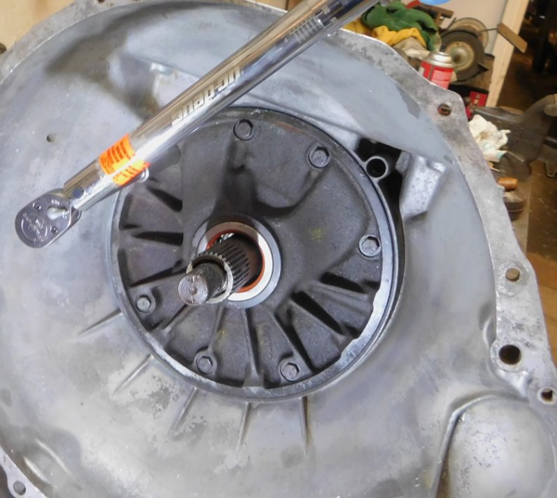 New seals and a new bushing are installed on the front pump, which was disassembled and cleaned previously. New cast iron seal rings are installed. I cleaned all the bolts, and found this one that looked like it was about to snap off. I replaced it with a new bolt and torqued the assembly in place.