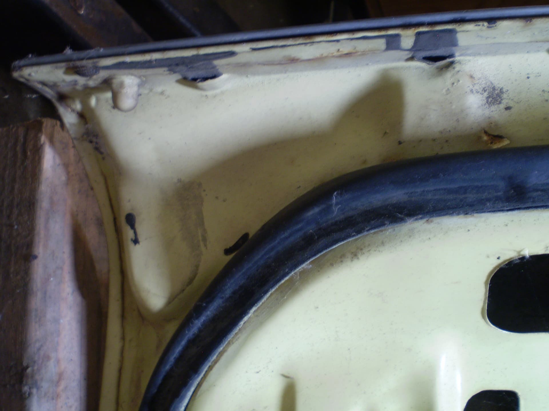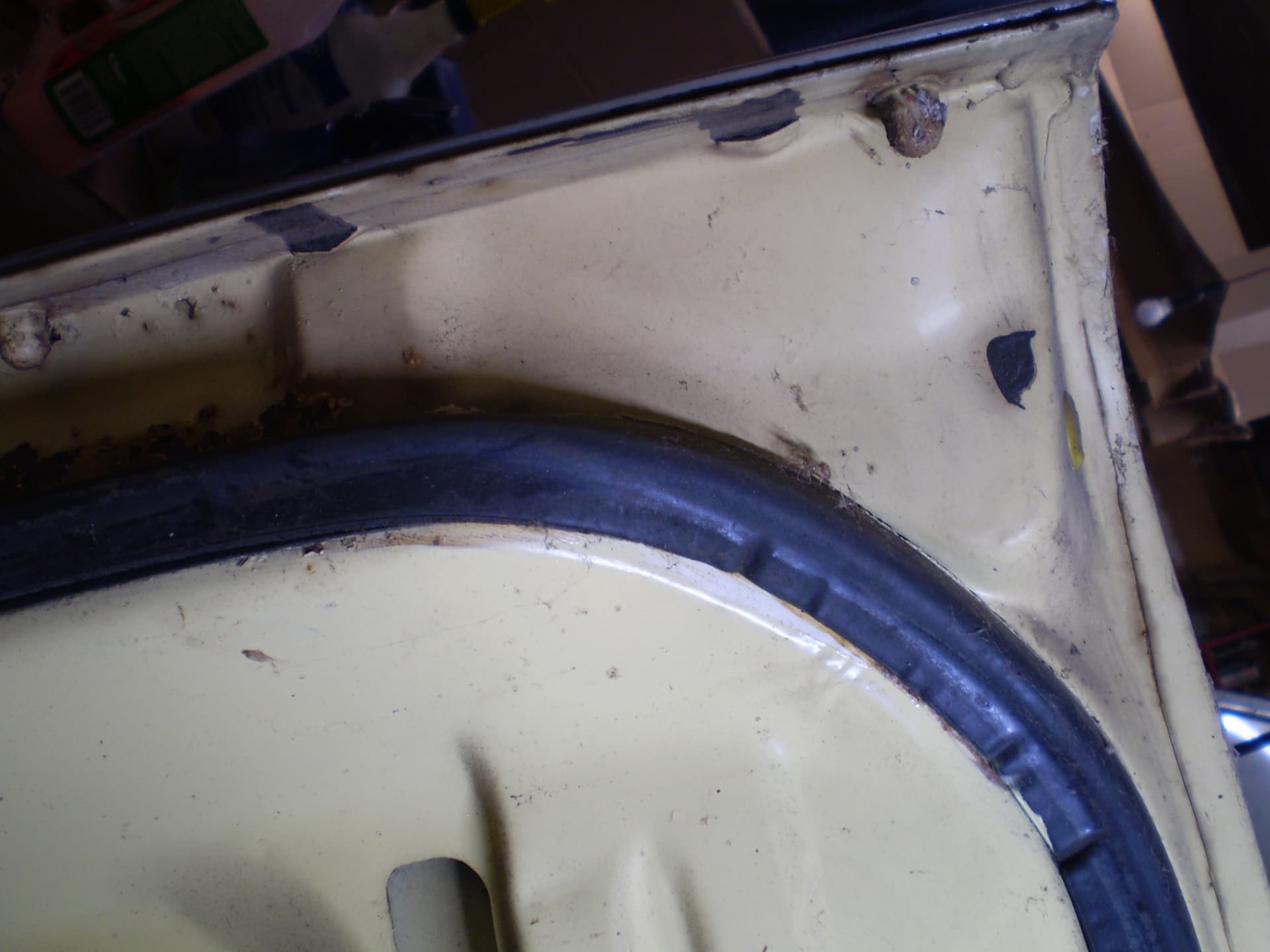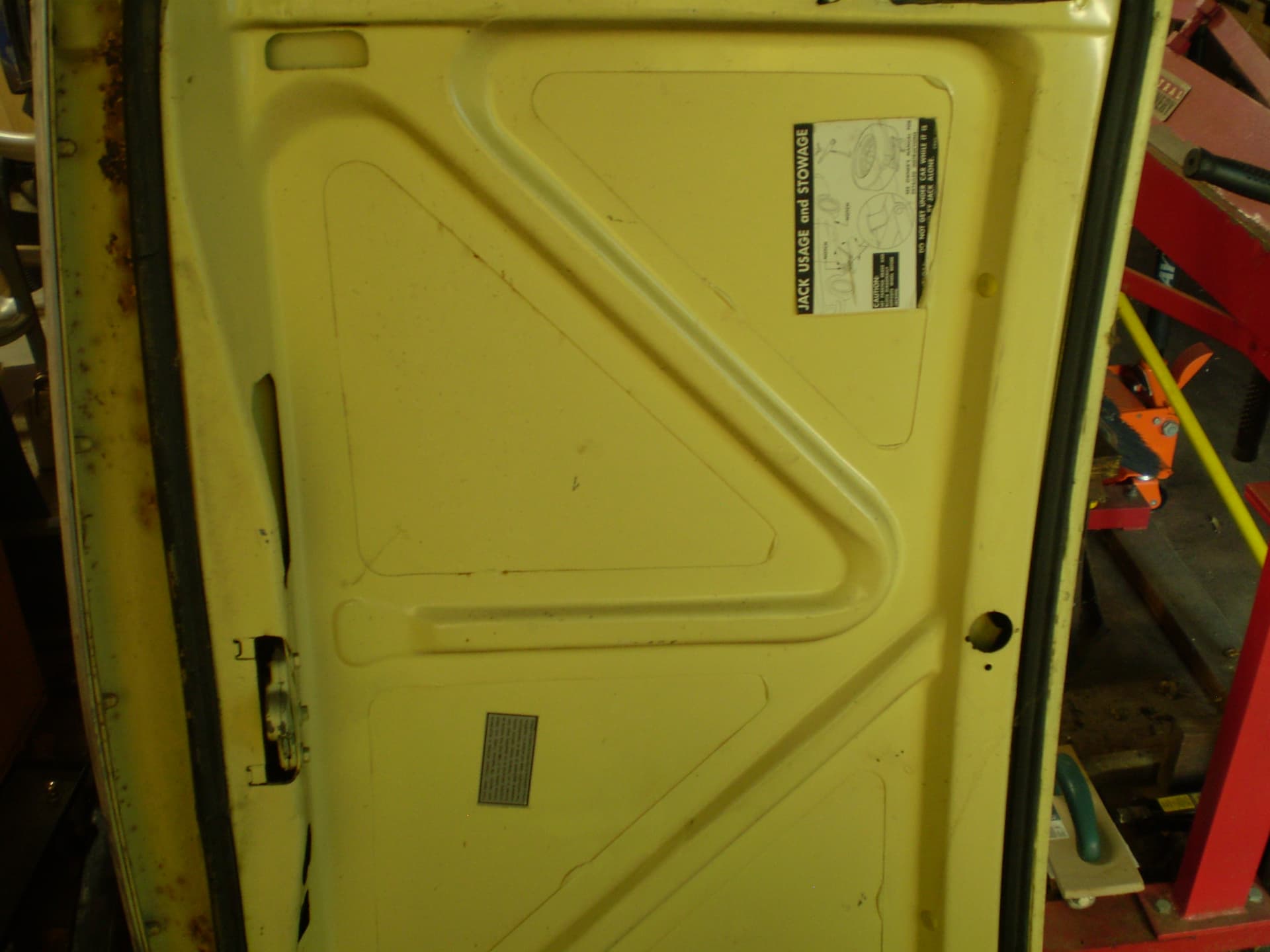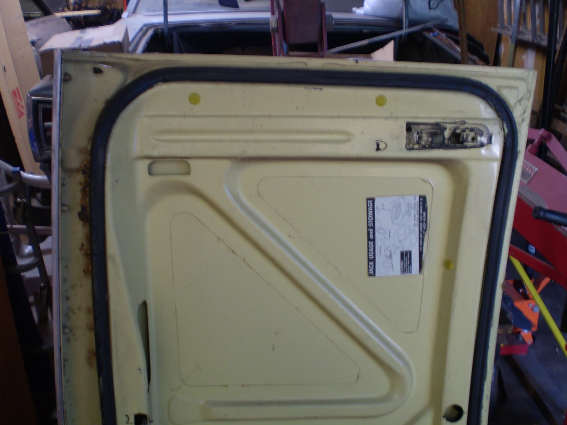 Its a F Dearborn car. The shock towers have big ugly holes from a cutting torch, someone thought it was a good idea in order to grease the upper arm pivot. The deck lid is in good condition, was professionally rustproofed at some point (see the yellow plugs). the inside surfaces were sprayed with black rustproofing, not undercoating. I hit a spot with the sander years ago I think there was a bubble in the paint I don’t remember for sure.