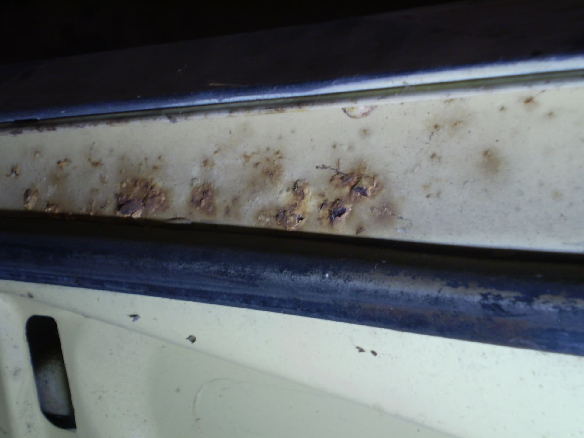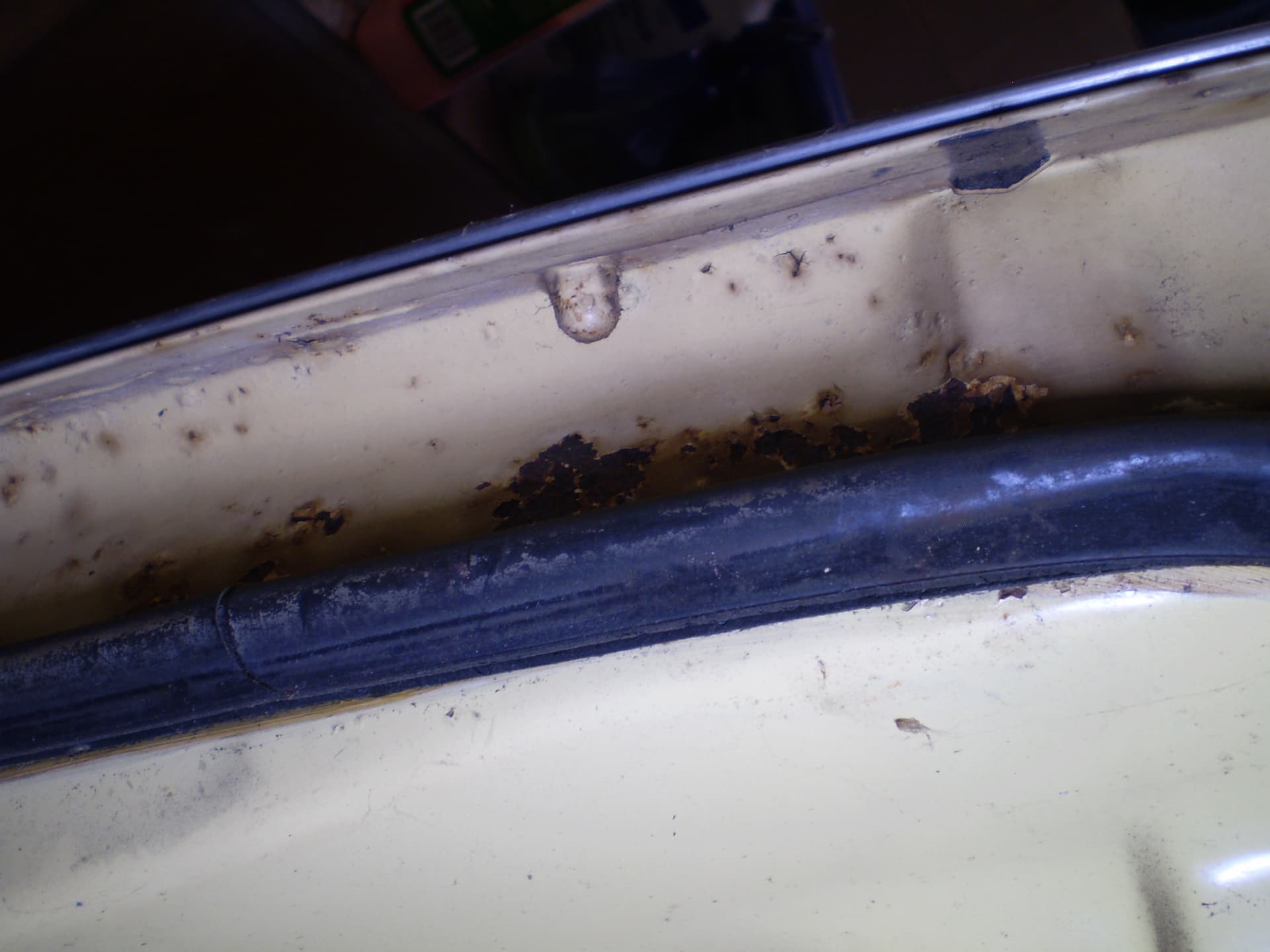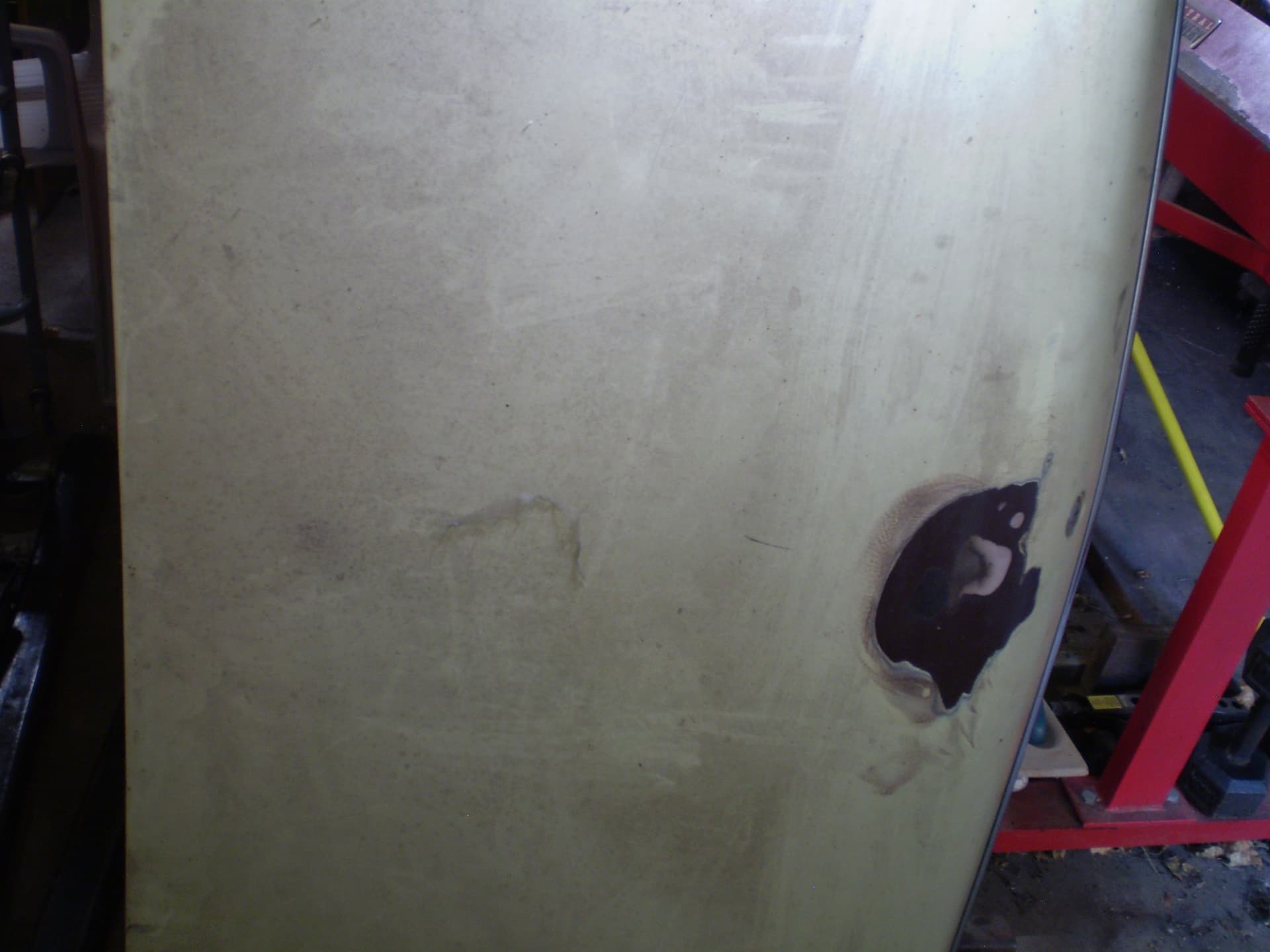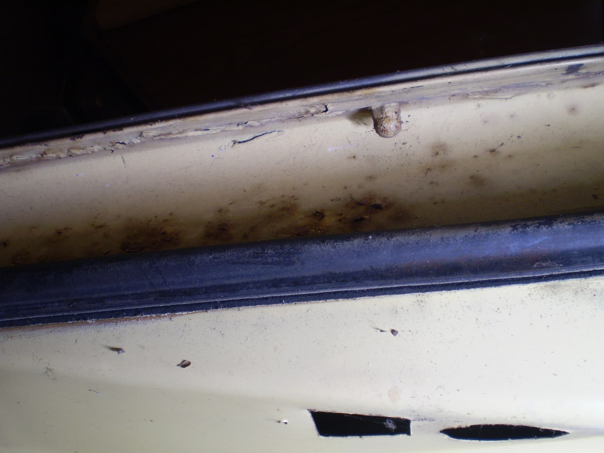 Its a F Dearborn car. The shock towers have big ugly holes from a cutting torch, someone thought it was a good idea in order to grease the upper arm pivot. The deck lid is in good condition, was professionally rustproofed at some point (see the yellow plugs). the inside surfaces were sprayed with black rustproofing, not undercoating. I hit a spot with the sander years ago I think there was a bubble in the paint I don’t remember for sure.