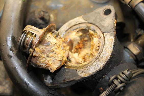 So, moving on I figure since I have a new thermostat I would get that installed. Upon cleaning all of the leftover antifreeze gunk out of it I could tell some of the metal inside had started to corrode. A little more scraping with the screw drive reviled a couple thin spots and a hole. Checking my parts supply, I don’t have an extra water neck. So, I’m in need of a C9AE8594E 390 FE water neck as well. It’s better to find this stuff out sitting in the garage vs along side of the road in a puddle of anti freeze.