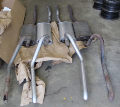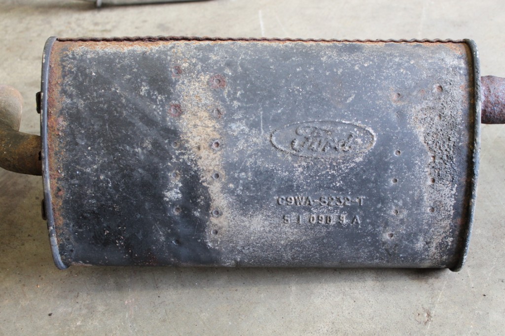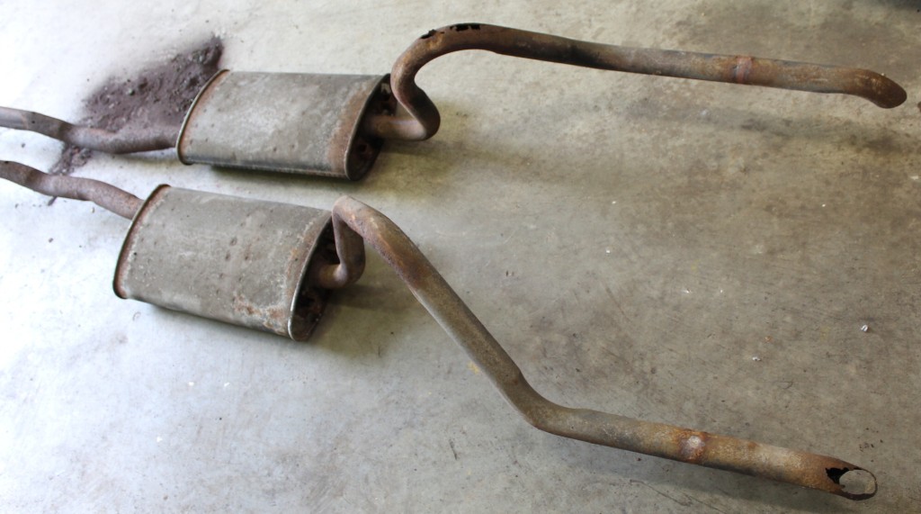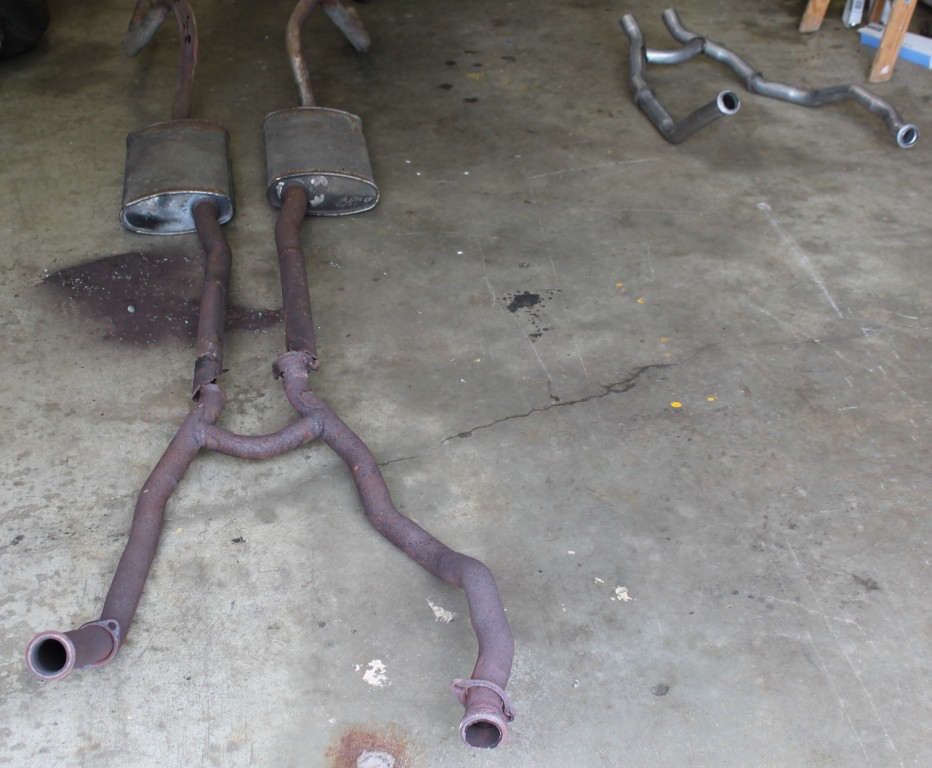 Moving on to the exhaust. The end of the H pipe was to rusted so I purchased the repo H pipe from Don. My first thought was, I could make new pipes from the H to the mufflers and the rest of the original system I could use. Upon more inspection I found holes in the tail pipe sections as well. Plan B replace all the pipe and use the original mufflers. Both mufflers are very solid on the outside. Once I had the exhaust removed I found one muffler still in good condition, but the passenger side muffler not so good. Rust inside with some mouse poison in it, and the internal pipe was rusted and rattling around. Plan C, I just order the rest of the repo exhaust system from Don and will install the whole system. I was afraid it was going to sound like crap having one good muffler and one with a rusted pipe rattling around inside.