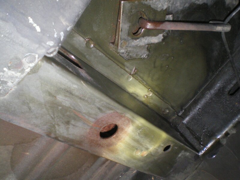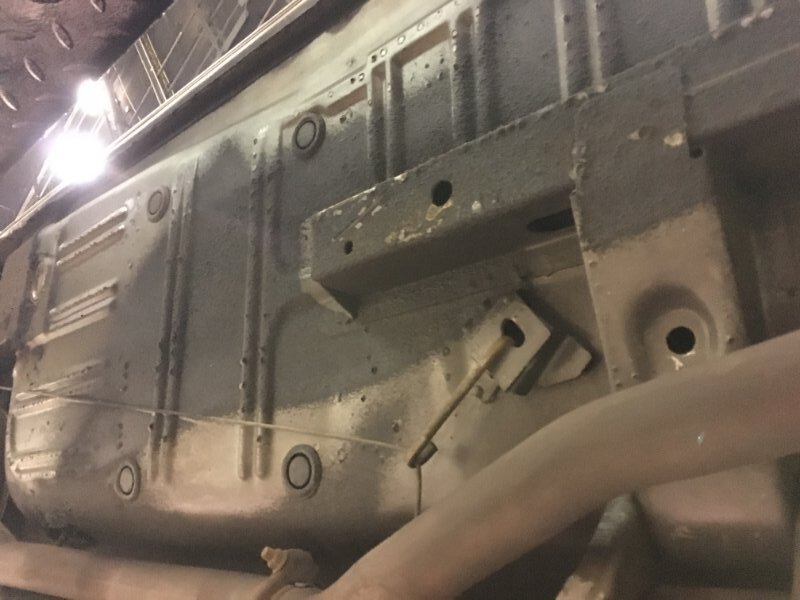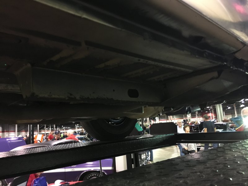 Here is another picture of my green cougar convertible, it is looking up from under the passenger side, notice the dolly pattern. It has wet look because I was washing with degreaser, I also have the torch light shinning up on the floor. I don’t see any shadow left by the dolly if the car was sprayed from the sides. Also if the car had been sprayed from the side the paint operator would have needed to get down on his back/side to spray the trans tunnel and the diff/rear axle tunnels. The car also seems to have very limited amount of the black sound absorbent material applied.
