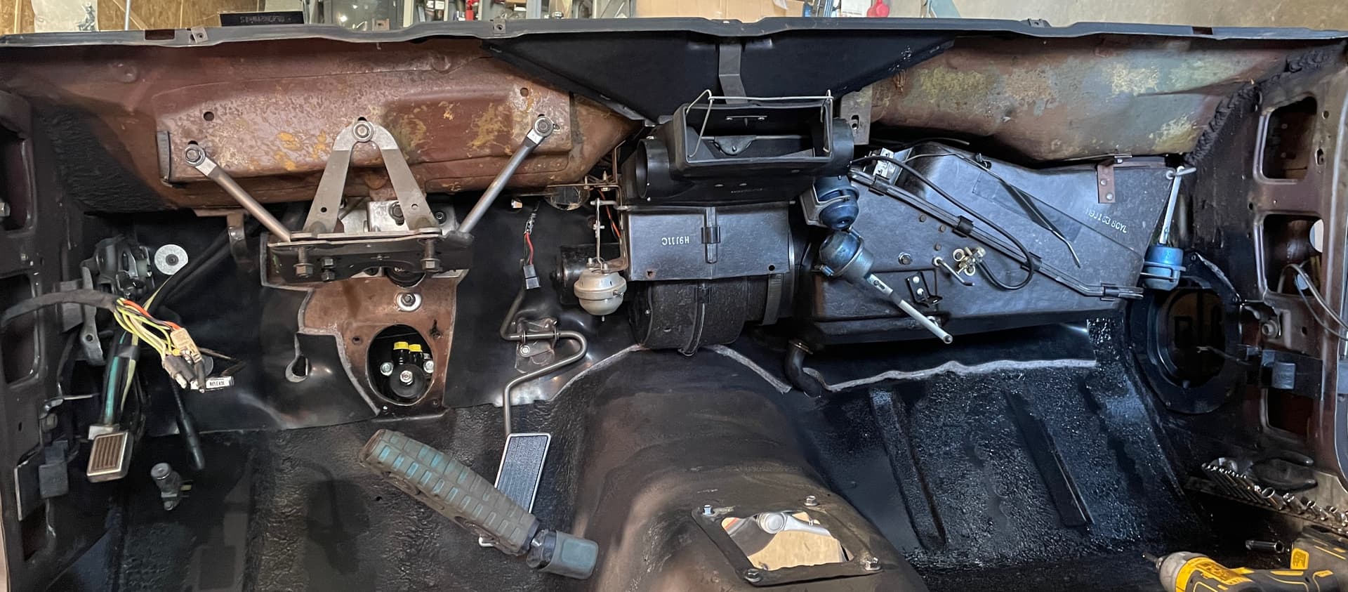 Ac box disassembled, metal derusted, new foam, evaporator flushed and fins cleaned/straightened. Column dash brackets derusted and installed. Wiper motor cleaned and installed. Brake booster blasted, painted, and reinstalled…working on rear axle now so it can roll by next week….fingers crossed