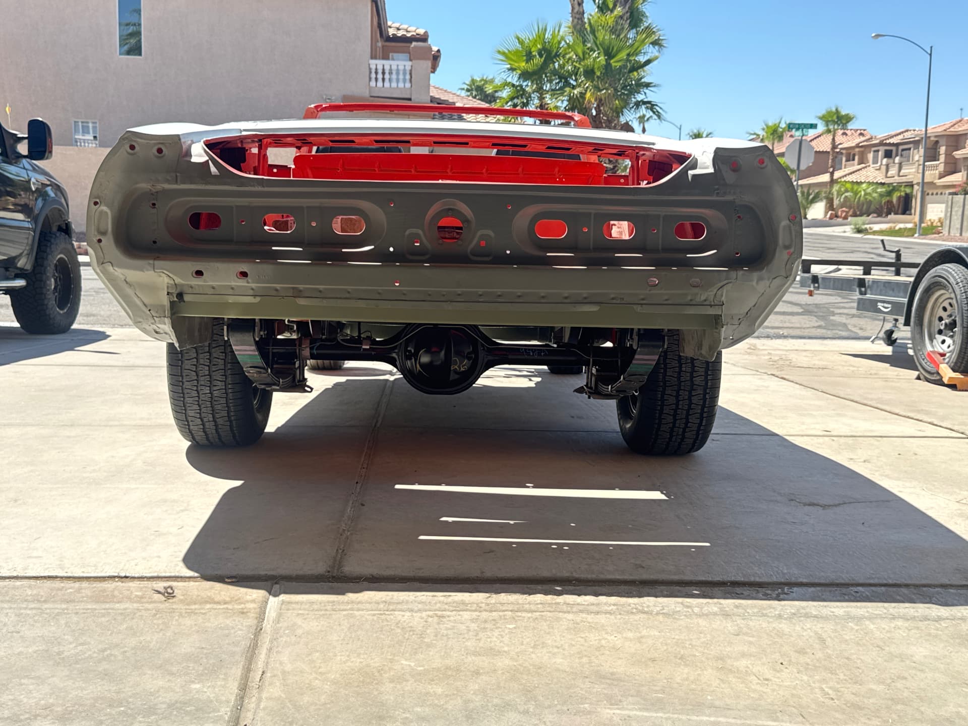 Well, this picture is not in chronological order, but I just found it. This is Phoenix just after the inferno loaded on a trailer on its way to me. Kinda of a grainy picture, it started and was driven onto the trailer. I wish I could unsee the whitewall tires!
