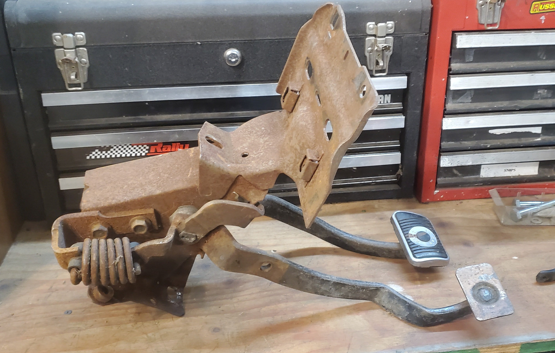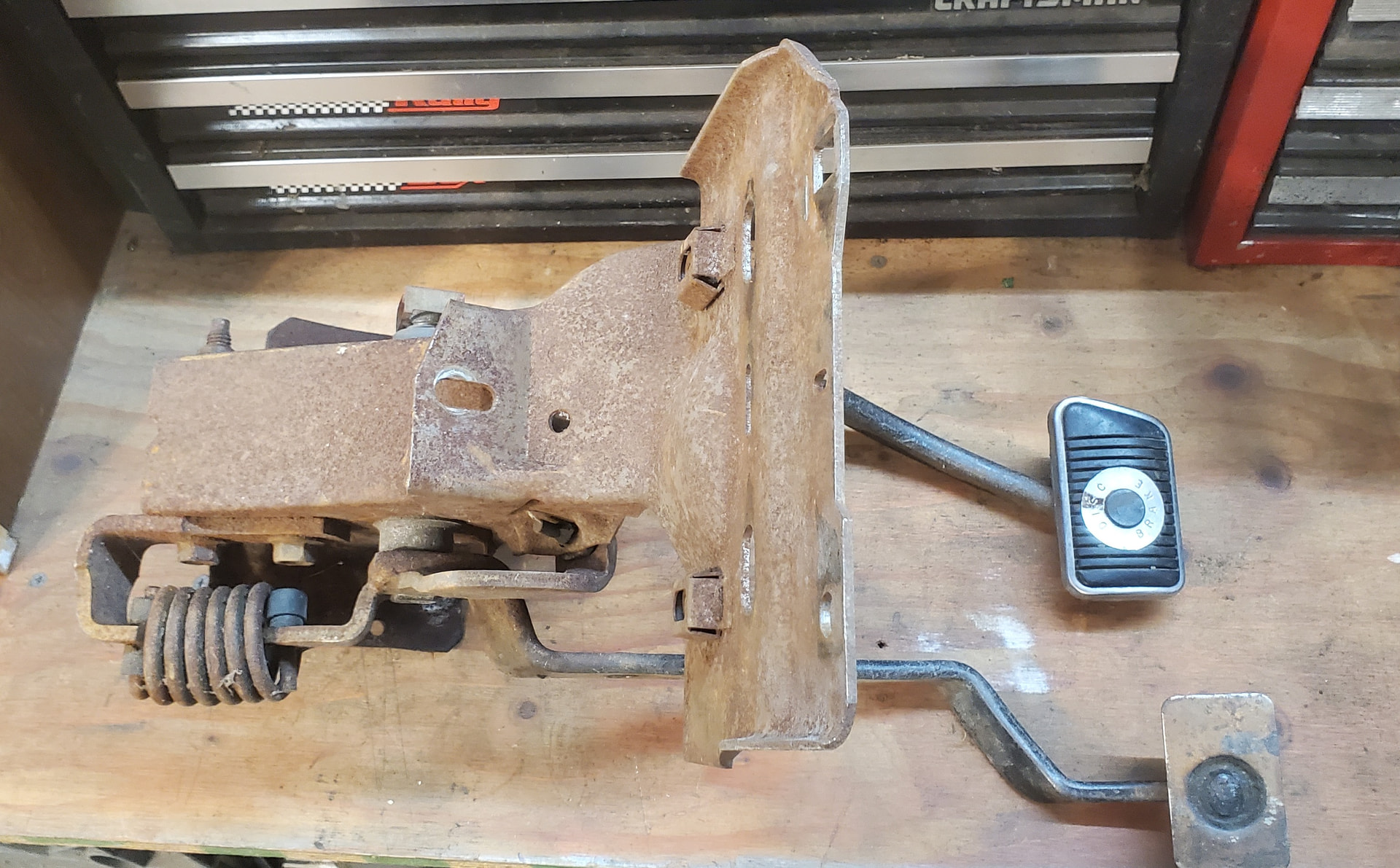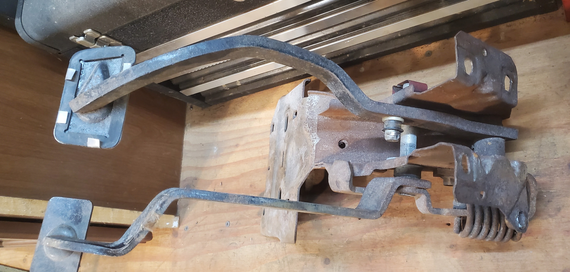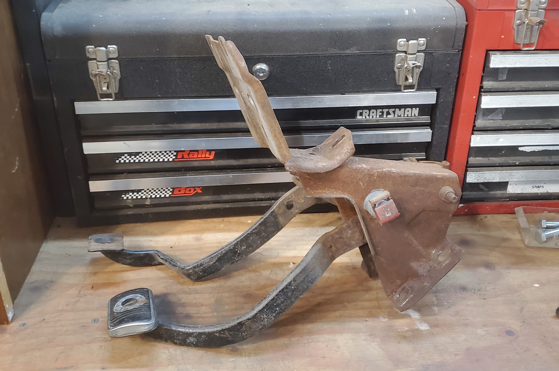 part 1, a complete 1970 pedal hanger for a manual transmission and power disc brakes. This is a little rusty, has the brake penal pad, the short brake pedal for this application, clutch pedal, return spring and hanger as shown in the pictures. I’m asking $350.00 plus shipping