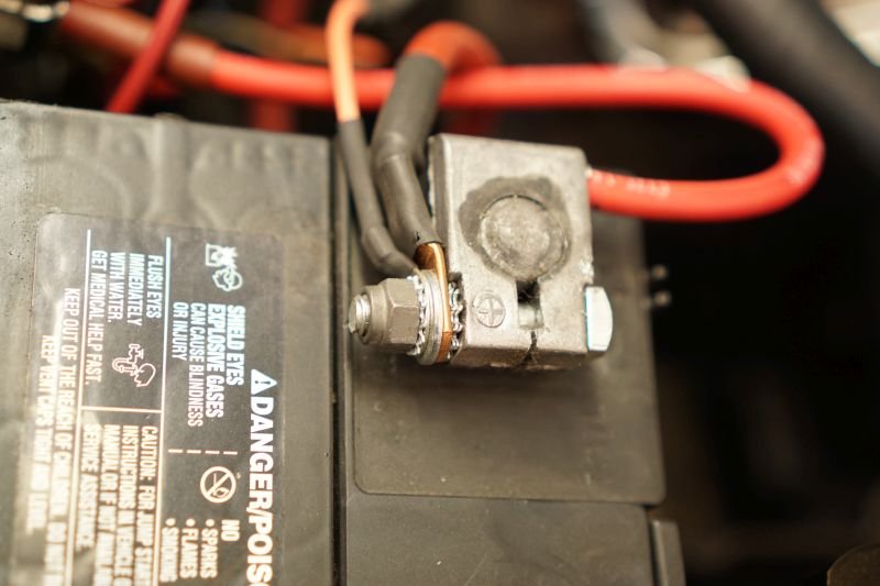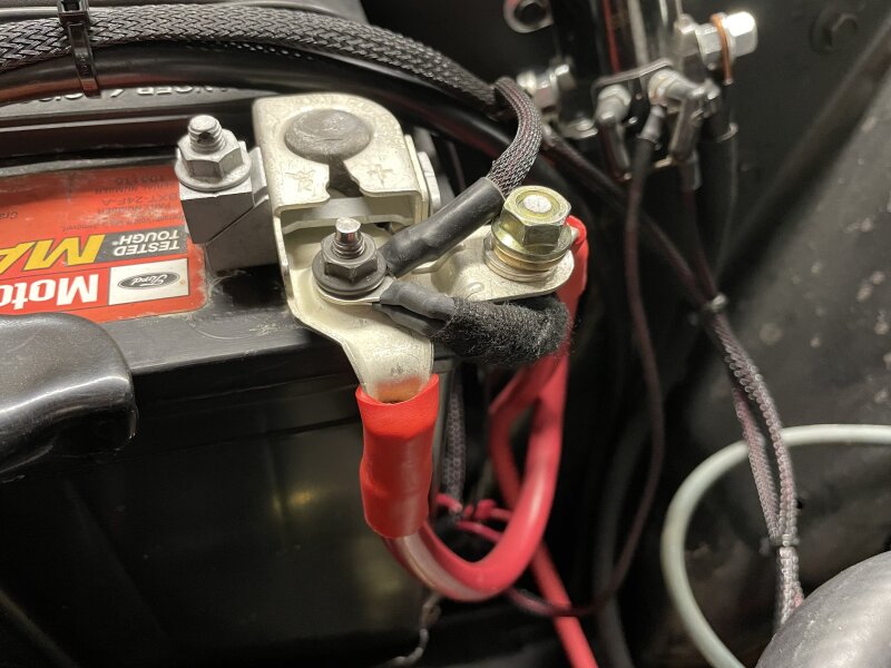 Here’s my examples of wires with eyelets added to the posts. On the positive battery terminal I used a slightly longer bolt as I needed more room. I am using the reproduction/upgraded “high draw” battery cables.