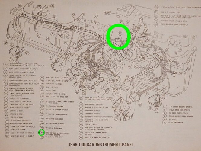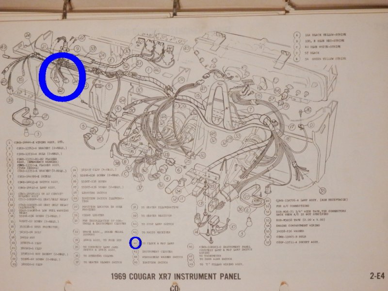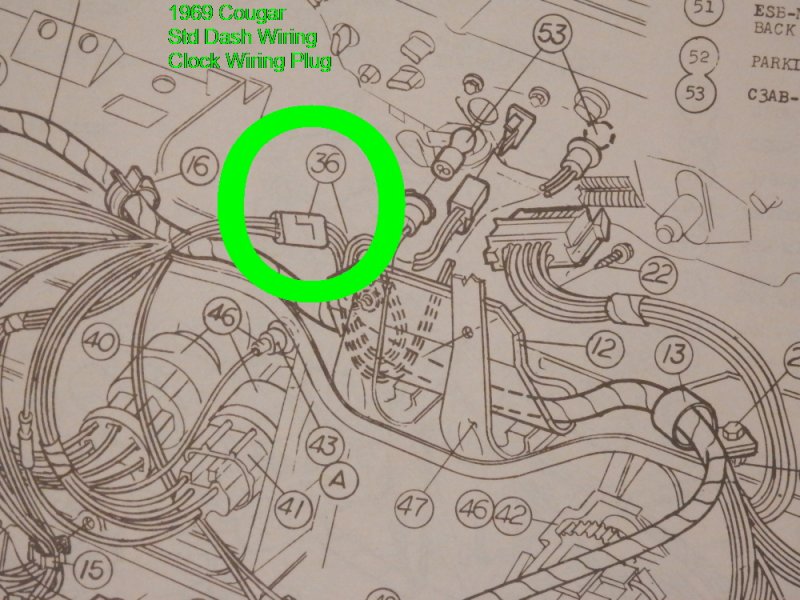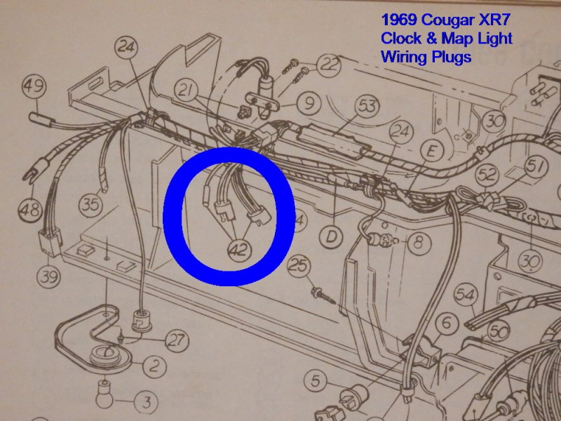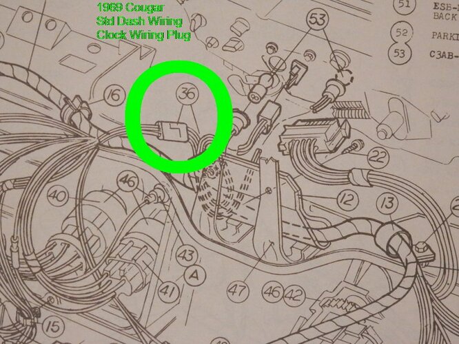 Below are scans of the schematics for both Standard & XR7 dash wiring. Referencing the Std. schematic (for instrument clusters that were equipped with a clock), plug connection #36 would connect to auxiliary harness C9ZB-15A006-B that would then connect to the clock’s male spade terminals at the back of the cluster. You could consider making a 2-wire jumper harness (12-volt positive wire & ground wire) that would connect to Plug #36, and splice into a modified version of the clock wiring harness that you already have. The existing female / male plug on the clock harness could be used as the splice source. The non-used remaining female / female plug could be wrapped with electrical tape as a precautionary measure… but would not necessarily need to be removed. The clock wiring harness that you show above is for 1970 and is slightly different in design than the 1969 clock harness, but is adequately usable to achieve the clock install that you are doing. If that single wire is solid Black in color, then likely a ground source. If Blue or Purple, likely a 12 volt source. If not needed… you could choose to terminate the wire or loop-plug it into the corresponding positive / negative side of the female / female plug to contain the path. Perhaps you could hook a 12 volt battery charger to the female / male plug of your clock harness and use a test light to see if that single wire is positive or ground.