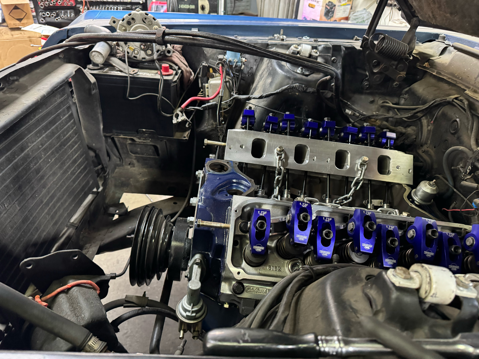 It’s going to be another week before my Cougar is ready, next week will be mainly for the Custom AutoSound system and painting the styled steel wheels. I took a trip to the shop to visit. What’s in now is the Borgeson steering, the Sanderson Shorty headers, the cats, the new exhaust and the Holley Sniper 2 EFI. Here’s a video, of the engine running and the exhaust. The shop owner is talking shop to a visiting vendor (and you can hear them over the din of the engine). I’m very happy with how easily the engine started (he just leaned over from outside and turned the key), how smoothly it idled, the reduced engine noise, and the relatively quiet exhaust, but with a retained burble. The shop installs around three Holley Snipers per month. He says the cats further help quiet the exhaust, which he attributes to their being so close to the manifold. There was also no smell back there, I believe the car will be more drivable and presentable. I’m happy so far.
