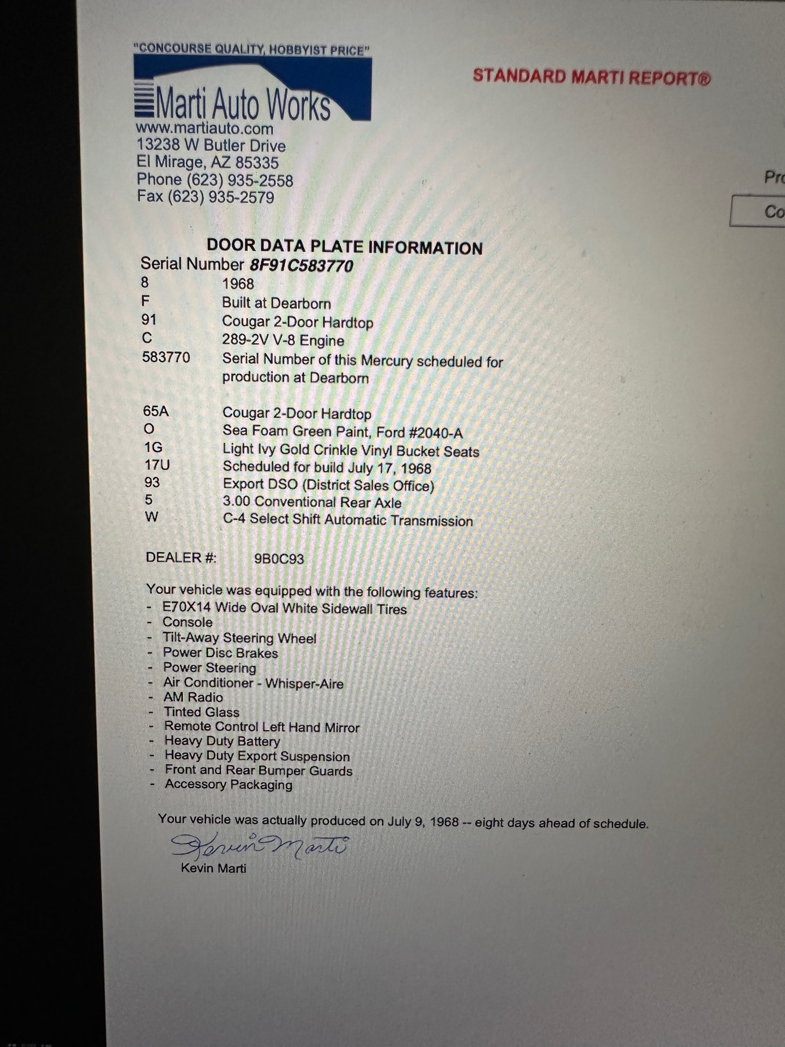 You Shou have gotten the Deluxe Marti report. It has much more information on it, I read that the export accessory package was things like light bulbs and other consumables that may not be readily available where the car was being exported to. .The 289 was the base engine for Mustangs for the full 1968 model year, however they were reintroduced to the Cougar line in Spring of 1968 but only in the standard body line and only with the base interior group. It was a marketing thing to make a less expensive Cougar,