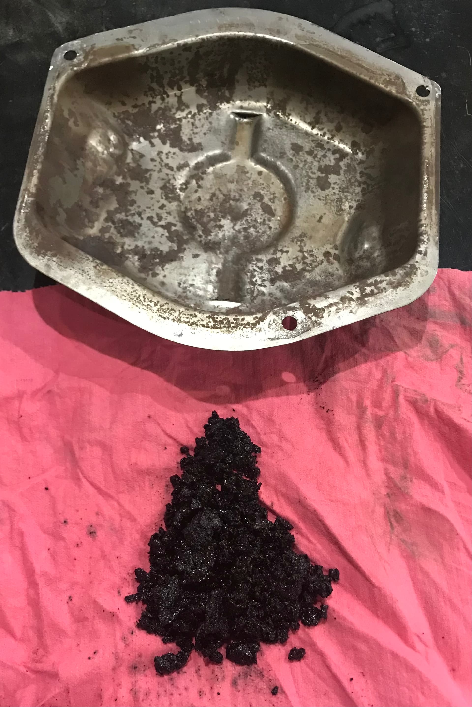 The residue is from the oil vapors getting baked as they enter the pan area. The waffle shaped cast iron is where the exhaust passes through to warm the carb and gets up to exhaust type temperatures in that area.