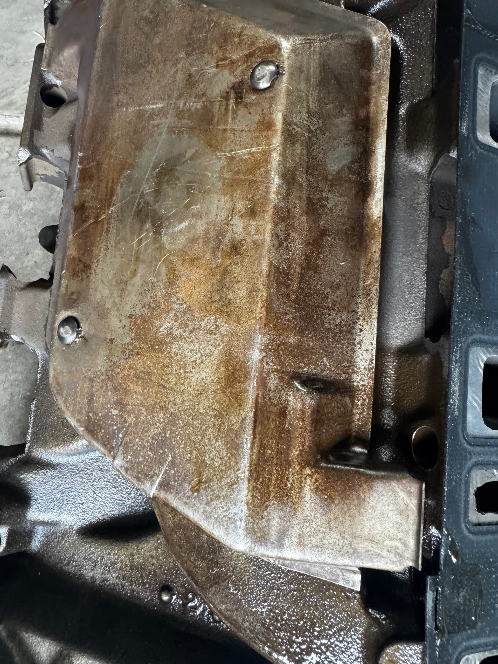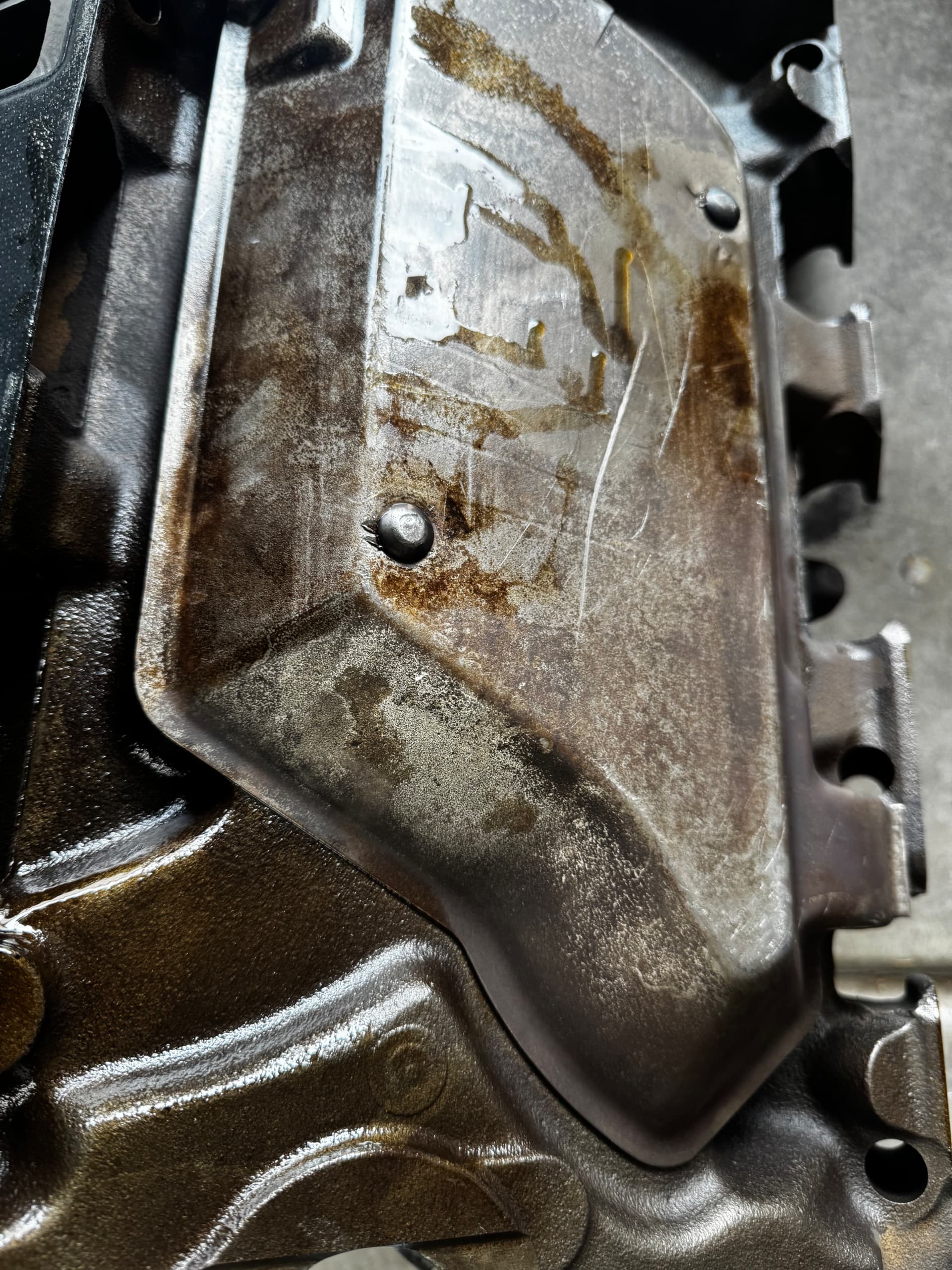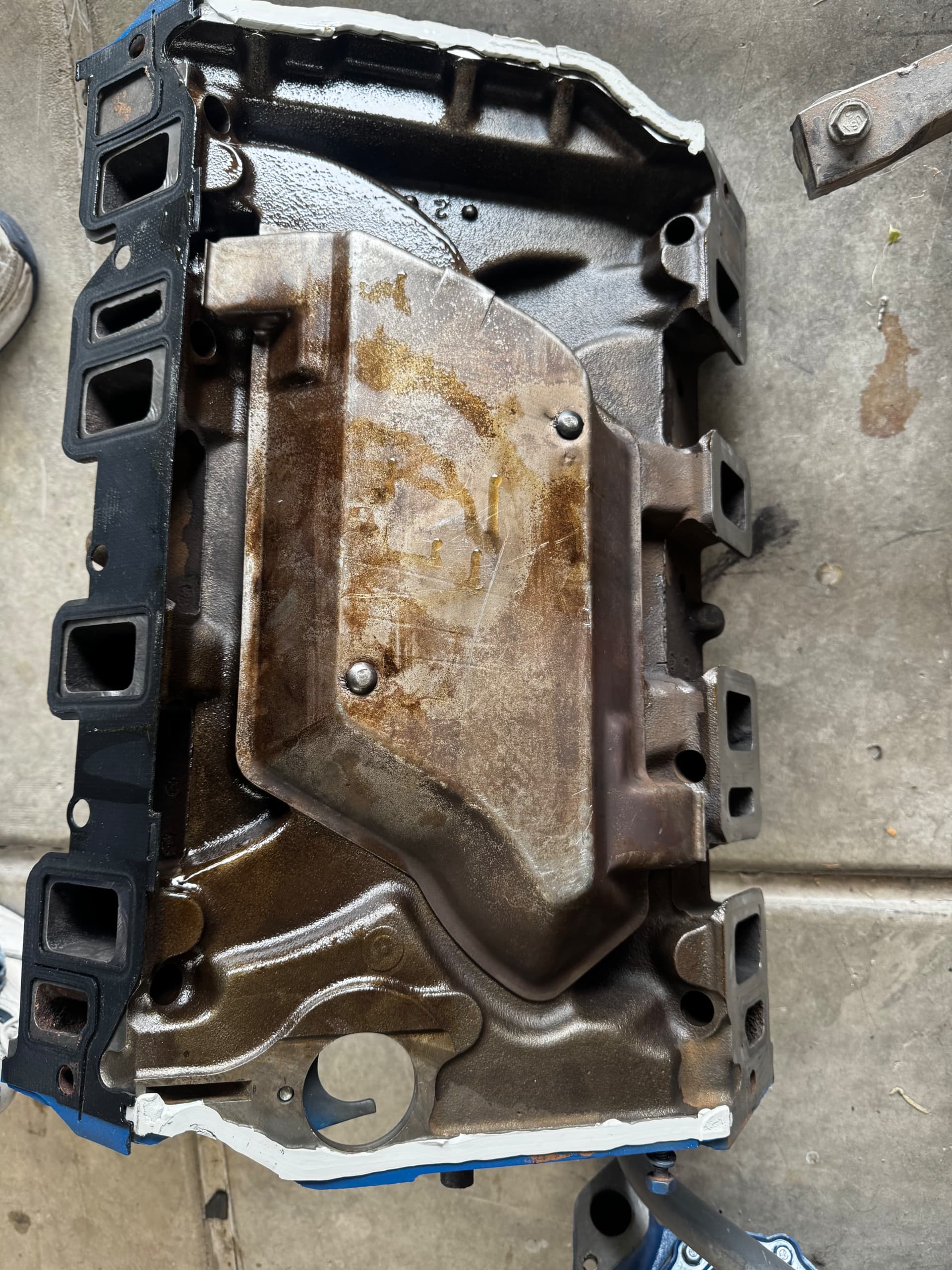 Now that the sheet metal pan is off you could have anchor, er intake sandblasted. I had this done on a cast iron intake and an aluminum intake.