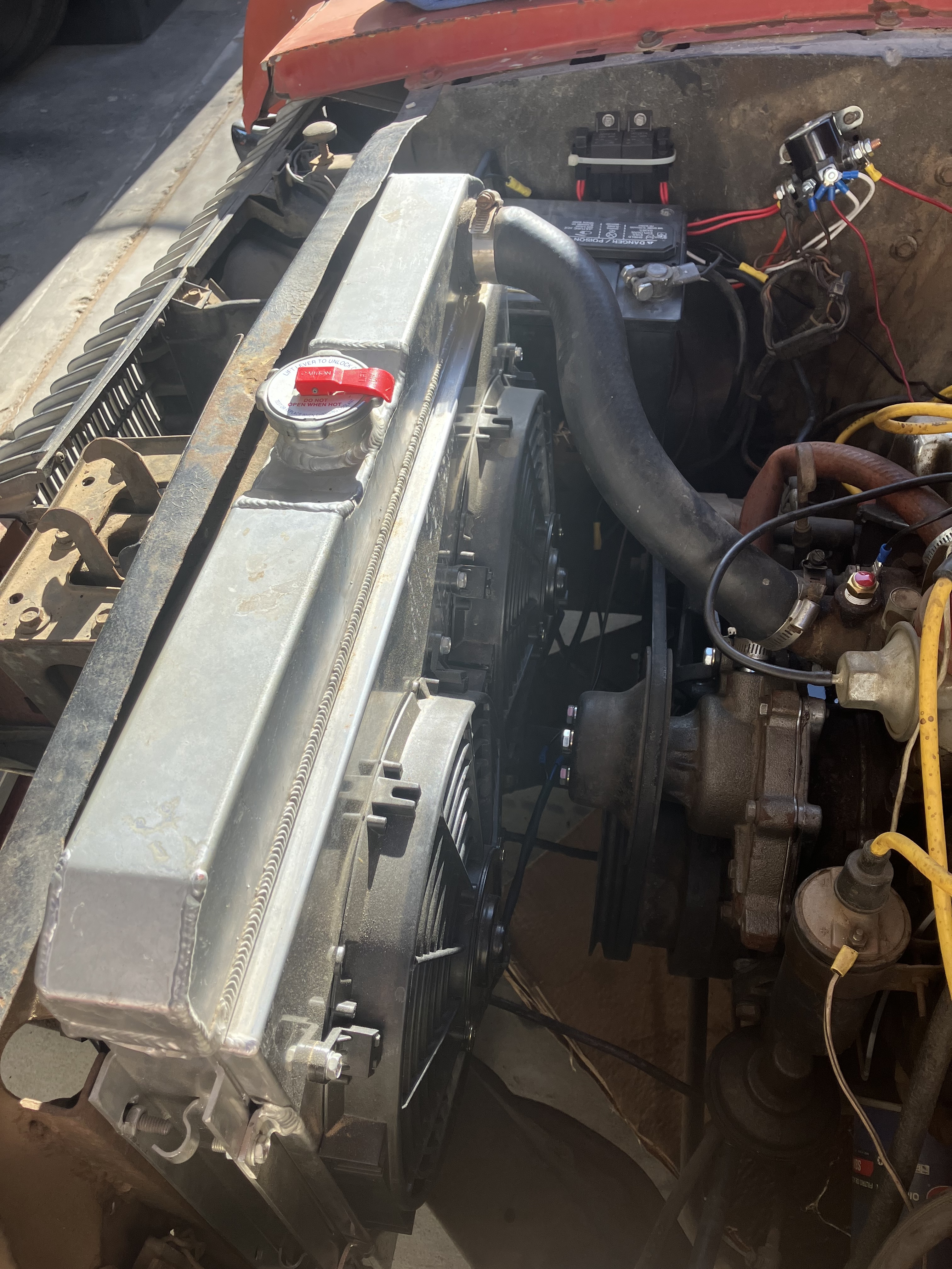 Still here and tinkering. Lotsa new stuff installed and still going. New radiator w/electric fans, water pump, hoses, carb. Seems to be running pretty good, temps are good, oil pressure good. Also managed to get the car to start with ignition key.