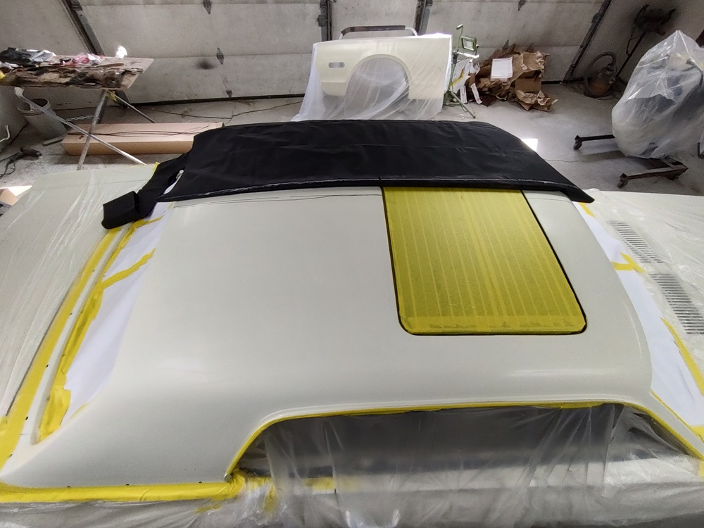 What makes this car tricky is the sunroof. The vinyl will not lay flat and will be somewhat deformed if the sunroof panel isn’t present. The panel itself is to be covered in vinyl at a later time. So I masked the panel and then put it in its opening. Since none of the mechanism is in place yet, I had to shim it in place with pieces of wood.