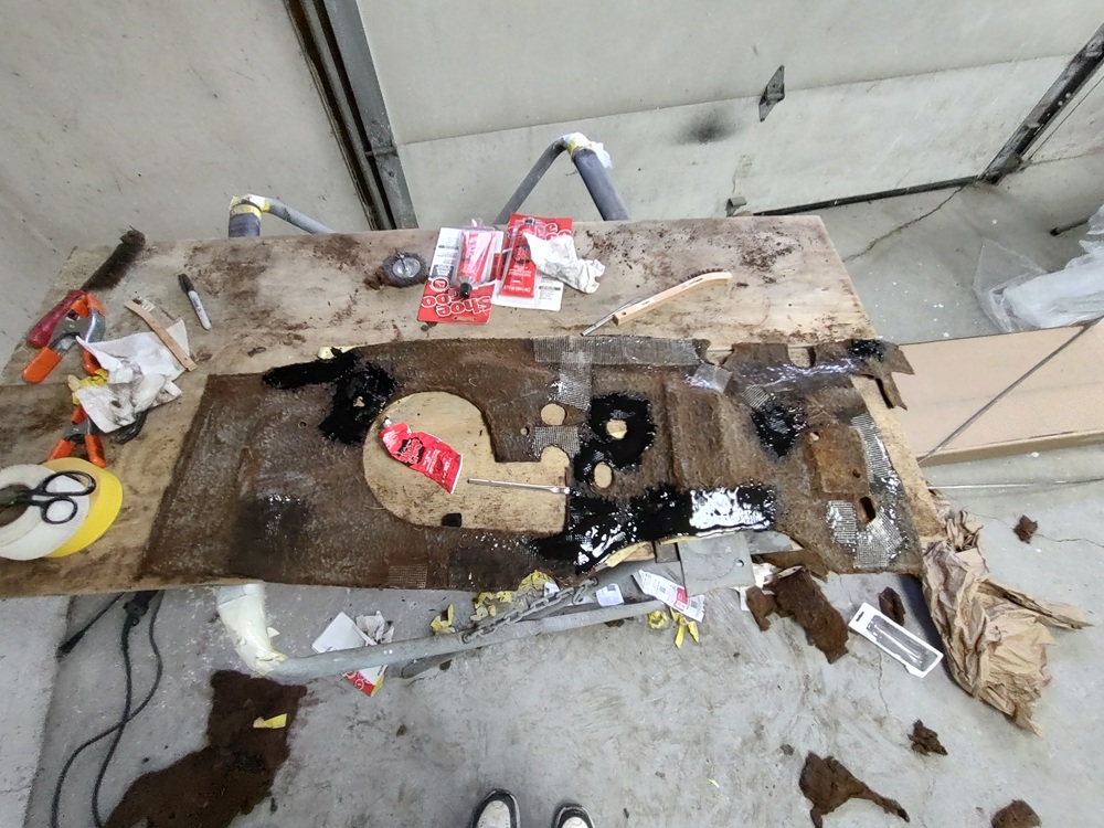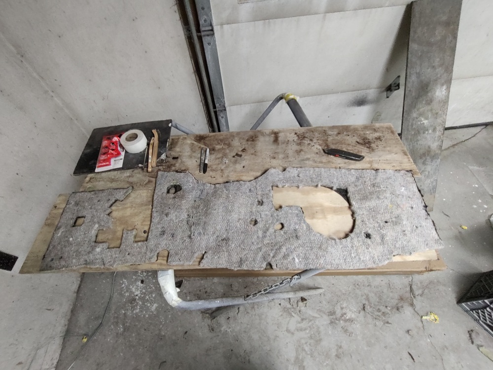 I started with the firewall insulation. The repos aren’t anything like the originals as far as appearance. My original one had lots of damage and smelled like mouse urine. So, learning from the folks at Concours Mustang I removed my old padding and gently scraped the back relatively bare so that I could patch it up with fiberglass mesh (the kind for drywall) and black Shoe Goo.