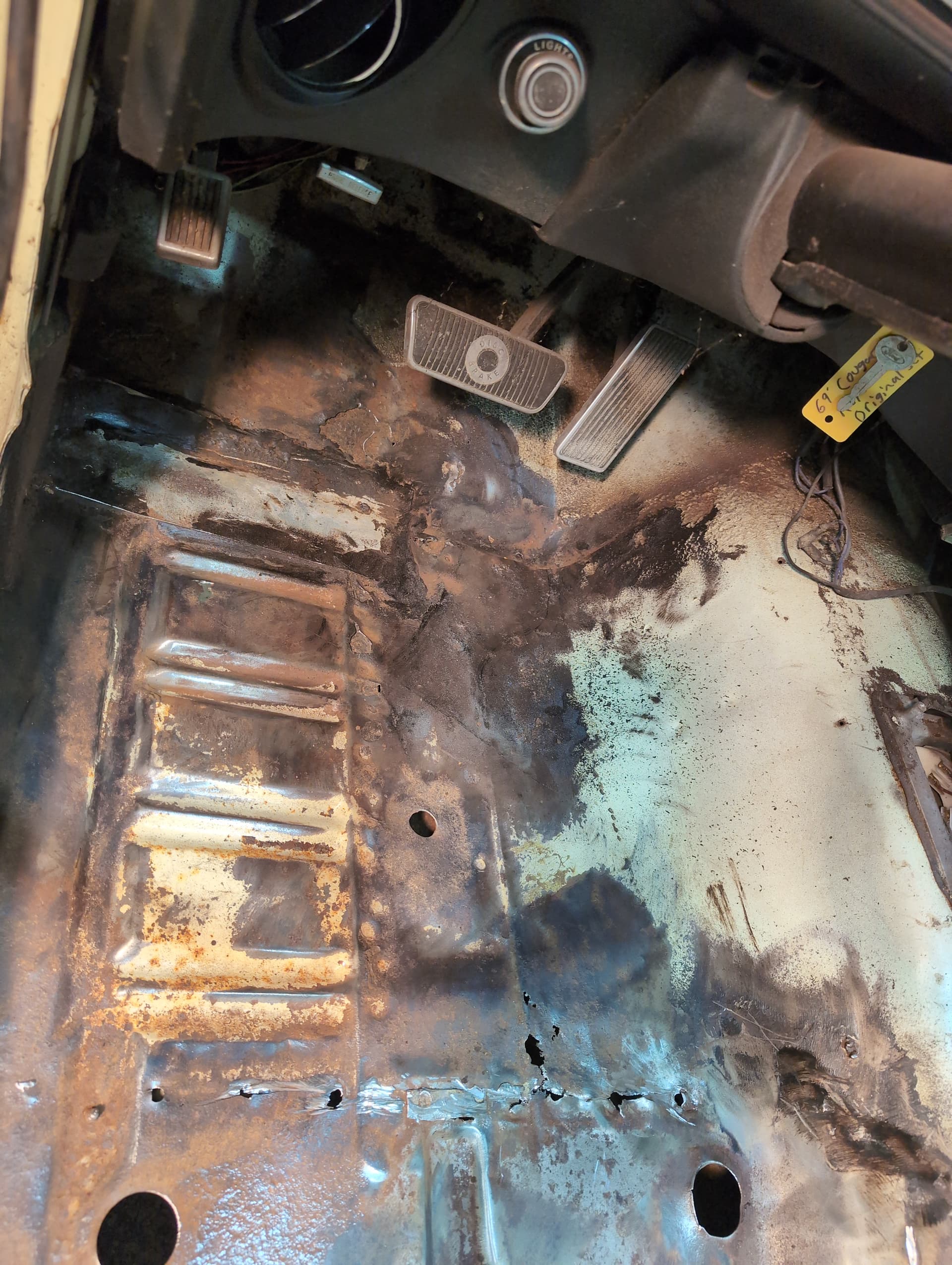 With rust it’s usually worse than you think. What shape are torque boxes, cowl area, rockers and trunk area like? Condition of some of those pieces help determine what you do with floor pans. Hard to tell what you’re up against with one pic. A search here on others projects might be very helpful for you to what others have done with rust repair. Hope it works out and you get to enjoy your Dad’s Cougar.