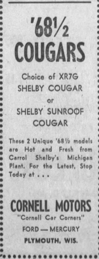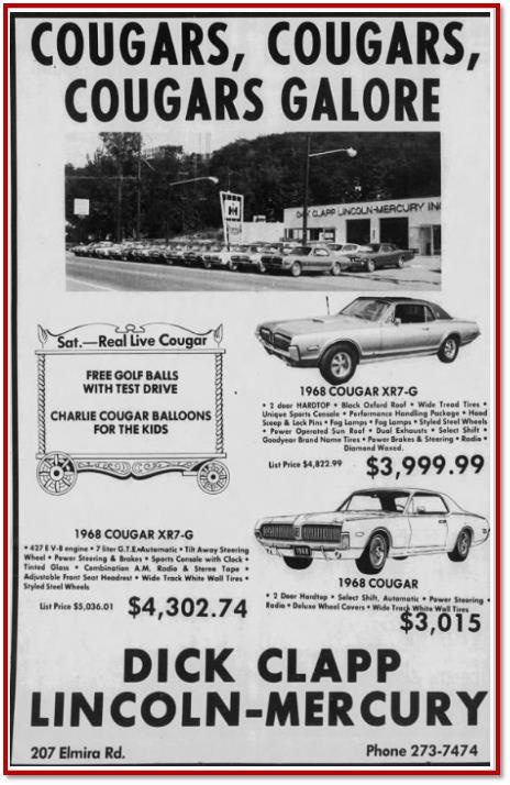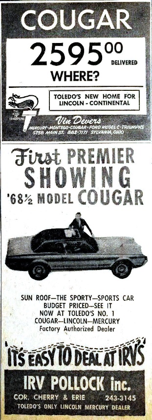 If you search Newspaper Archives for the Syracuse Post Standard Jan 10, 1968 page 28 you will find an ad featuring the Cougar. The first search is free.