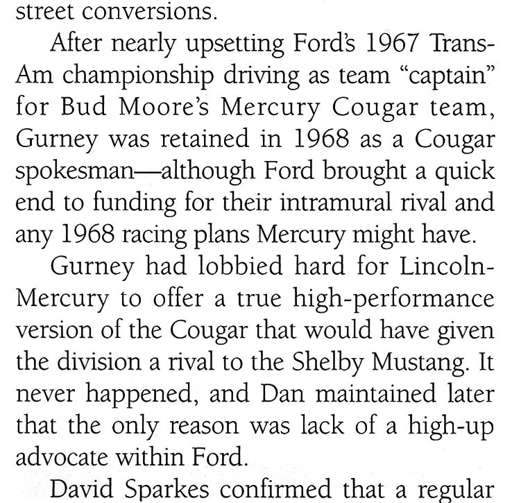You can imagine Gurney’s frustration at barely losing the '67 TA championship to the Shelby Mustangs. 1967 was an incredible year for Gurney and could have easily included the Trans-Am championship if Mercury had let him use his heads on the BME Cougars.