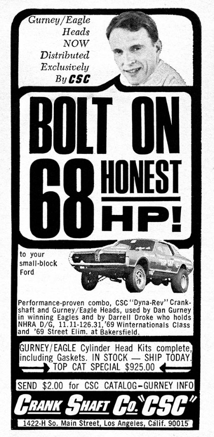 Interesting - I’ve seen that photo of Darrell Droke’s car before, but never the Crank Shaft Company advertisement. There is a 1 page article in one of the period car magazines, I think Car Craft, that used that photo and one of the engine compartment. Eagle cylinder heads for the 289 / 302 are very rare.