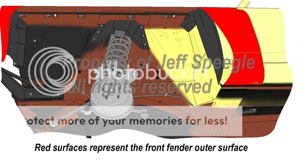 There is a difference between how to apply it and what gets seen in the final product. Red oxide (tone it a little differently than the floor but just a little and shot it firewall forward - especially the bottom of the frame rail, all the pockets at the bottom of the lower A arm mount, strut rod mount, front of the front cross member and such as well as the wheel side of the inner wheel well. In the wheel well (after sealant has been applied to all the right seams and pockets body color will be applied (doors, trunk lid and rear valance attached before this point) over the cowl sides, up over the front of the firewall in the wheel well and onto the rear panel of the inner fender up to about where the shock tower rear edge is. Black engine compartment black was applied after this covering the radiator support front and back side, engine compartment and those surfaces facing upward (like the strut rod mounts) allowing for allot of black overspray onto vertical surfaces and areas below. Remember old spray guns with high pressure put out allot more overspray that today’s HVLP guns so you have to make an effort to compensate for this
