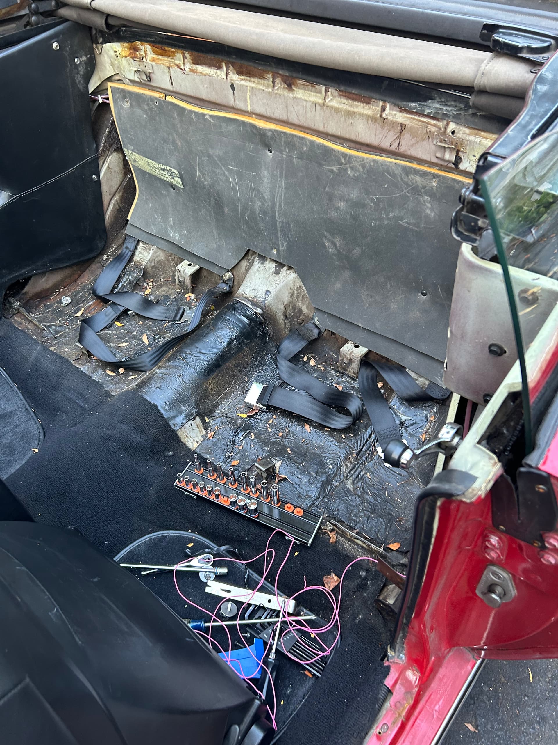 Pulling interior out to run wire to power panel in engine bay. This is to power the taillight sequencing system in my new Retina Blaster 5000 LED taillights. I’ll vacuum things out before I stuff it all back in.