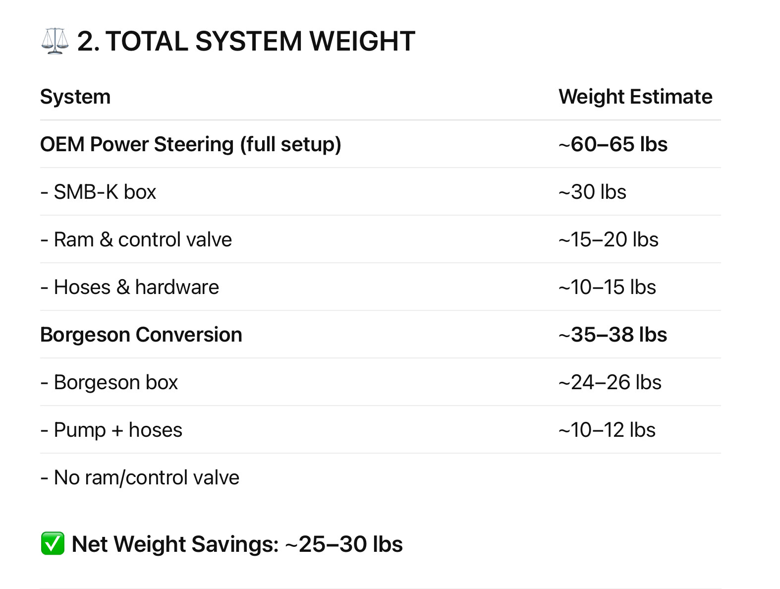 The steering box is around 5 lbs lighter, but the big weight savings is the 15-20 lbs from eliminating the ram & control valve, for total weight savings of 25-30 lbs.