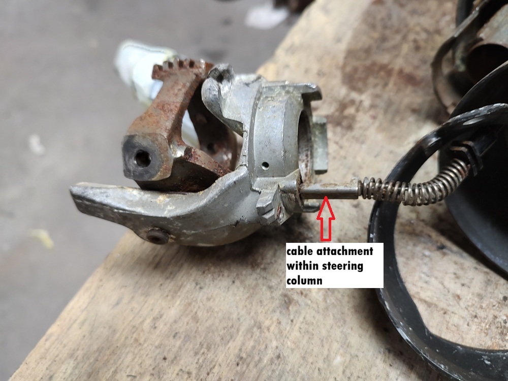 the cable has a “pawl” at the end of it that gets pulled back so that springs within the steering column knuckle can push the steering column away.