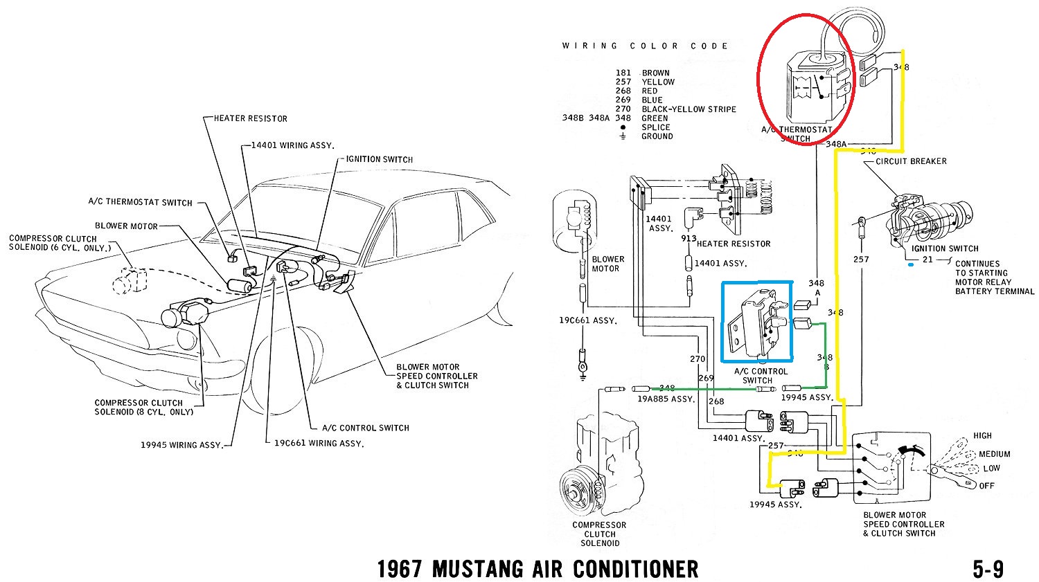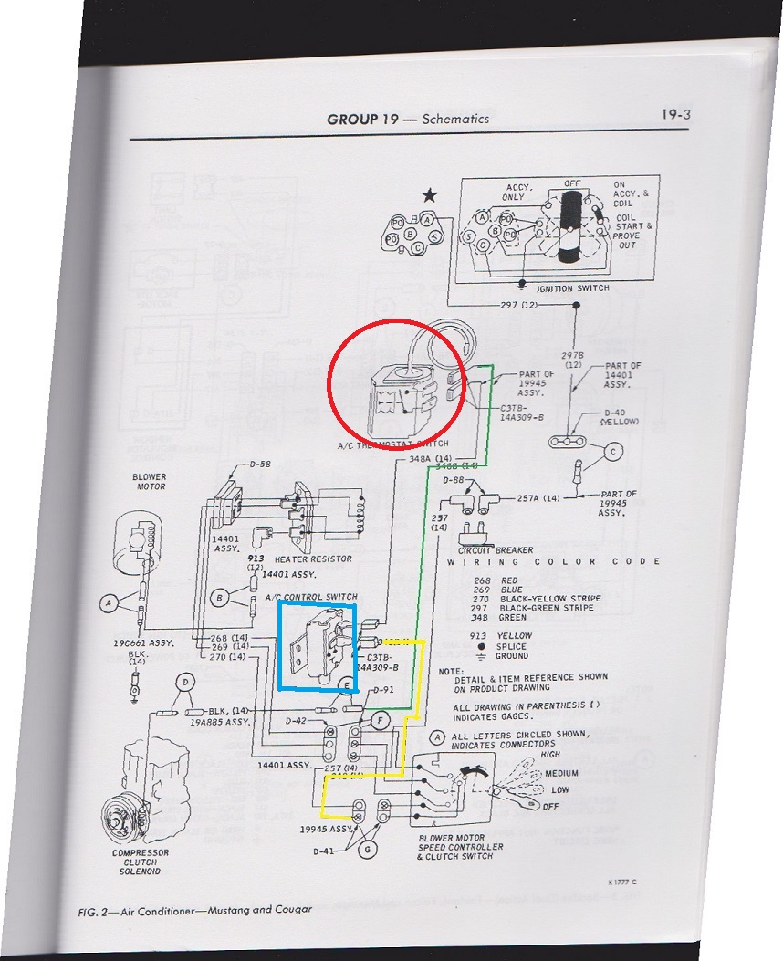 ETA: I know the B schematic shows a 67 Mustang, I chose it because it showed the same green wire going through the firewall from control switch to compressor as I found on my car.