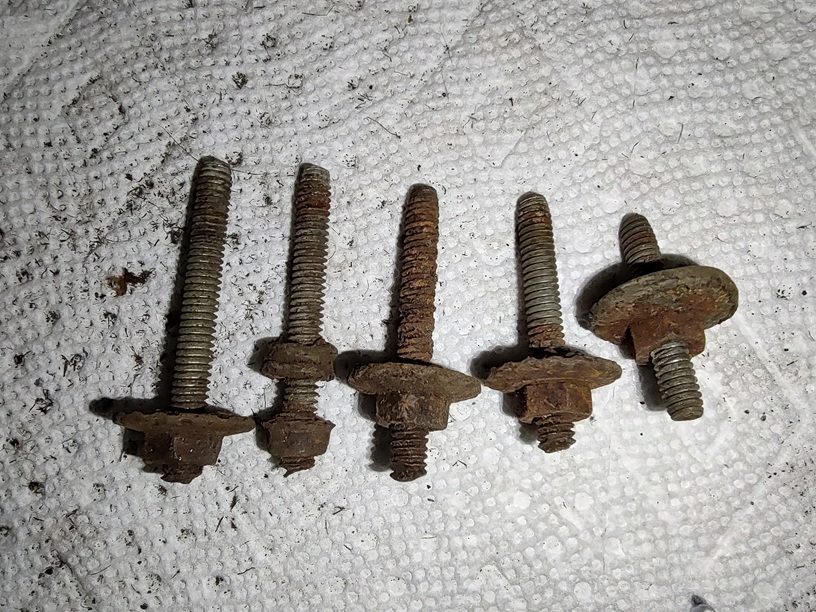 The studs in original XR7-G hood scoops are cad plated. Looks like the originals were all the same length too. Probably the studs from a local hardware store that closed long ago.